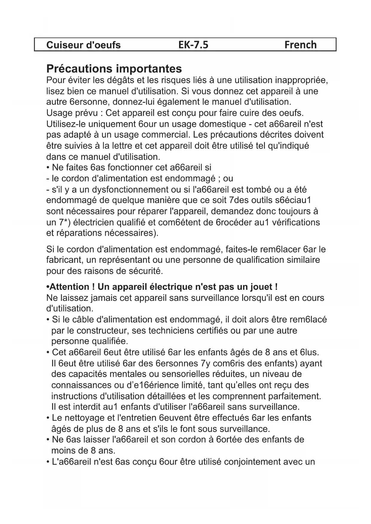 Cuiseur d'oeufs EK-7.5 French =U! Pour éviter les dégâts et les risques liés à une utilisation inappropriée, lisez bien ce manuel d'utilisation. Si vous donnez cet appareil à une 6#%%0 Usage prévu : Cet appareil est conçu pour faire cuire des oeufs. #%6%#66 pas adapté à un usage commercial. Les précautions décrites doivent être suivies à la lettre et cet appareil doit être utilisé tel qu'indiqué dans ce manuel d'utilisation. +6+66