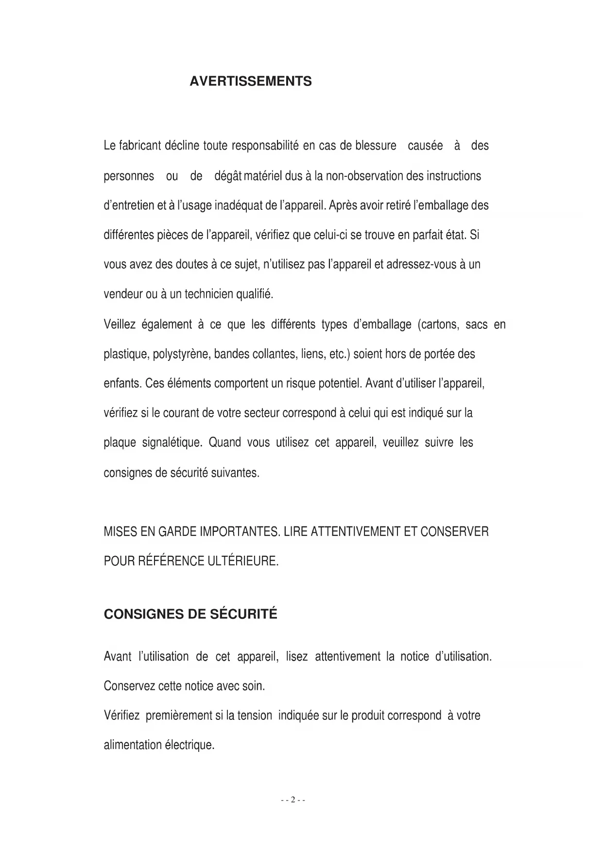 L’ENVIRONNEMENT …………………….……19- - 2 - - AVERTISSEMENTS Le fabricant décline toute responsabilité en cas de blessure causée à des personnes ou de dégât matériel dus à la non-observation des instructions d’entretien et à l’usage inadéquat de l’appareil. Après avoir retiré l’emballage des différentes pièces de l’appareil, vérifiez que celui-ci se trouve en parfait état. Si vous avez des doutes à ce sujet, n’utilisez pas l’appareil et adressez-vous à un vendeur ou à un technicien qualifié. Veillez également à ce que les différents types d’emballage (cartons, sacs en plastique, polystyrène, bandes collantes, liens, etc.) soient hors de portée des enfants. Ces éléments comportent un risque potentiel. Avant d’utiliser l’appareil, vérifiez si le courant de votre secteur correspond à celui qui est indiqué sur la plaque signalétique. Quand vous utilisez cet appareil, veuillez suivre les consignes de sécurité suivantes.