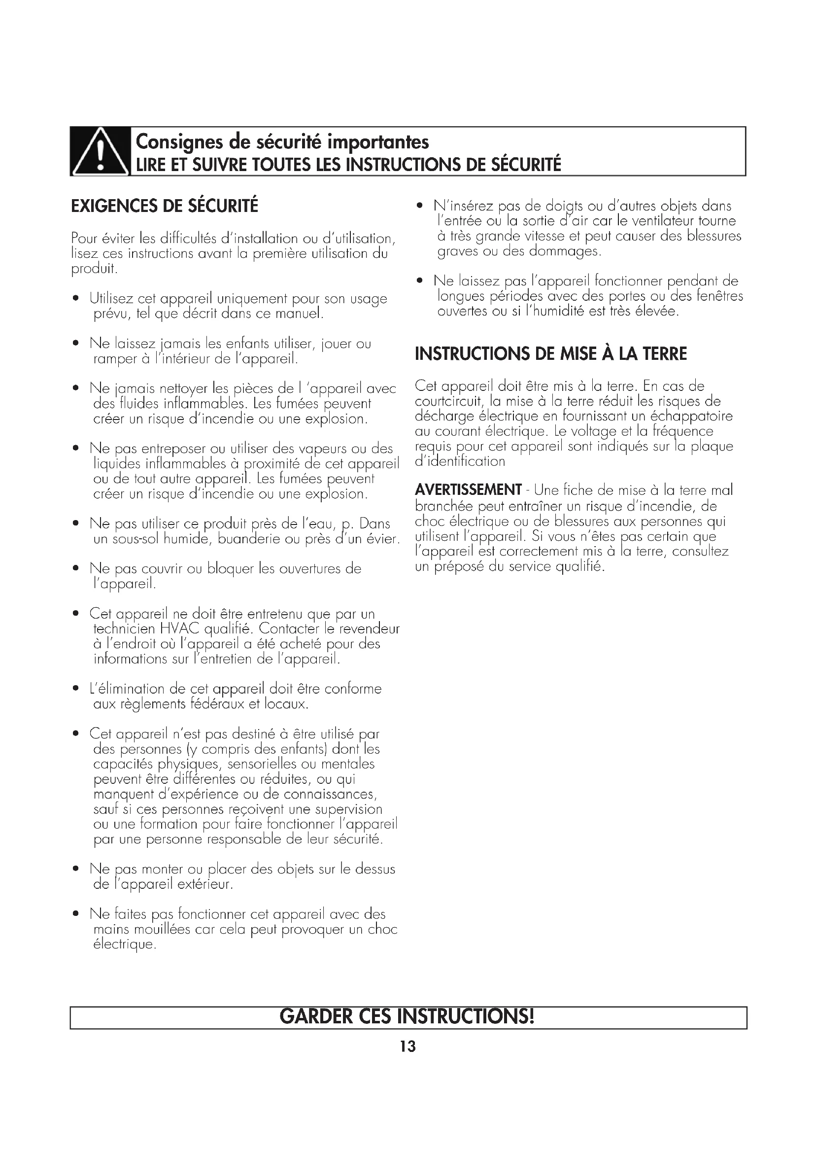 Cet appareil doit être mis à la terre. En cas de courtcircuit, la mise à la terre réduit les risques de décharge électrique en fournissant un échappatoire au courant électrique. Le voltage et la fréquence requis pour cet appareil sont indiqués sur la plaque d’identification AVERTISSEMENT - Une fiche de mise à la terre mal branchée peut entraîner un risque d’incendie, de choc électrique ou de blessures aux personnes qui utilisent l’appareil. Si vous n’êtes pas certain que l’appareil est correctement mis à la terre, consultez un préposé du service qualifié. Consignes de sécurité importantes LIRE ET SUIVRE TOUTES LES INSTRUCTIONS DE SÉCURITÉ