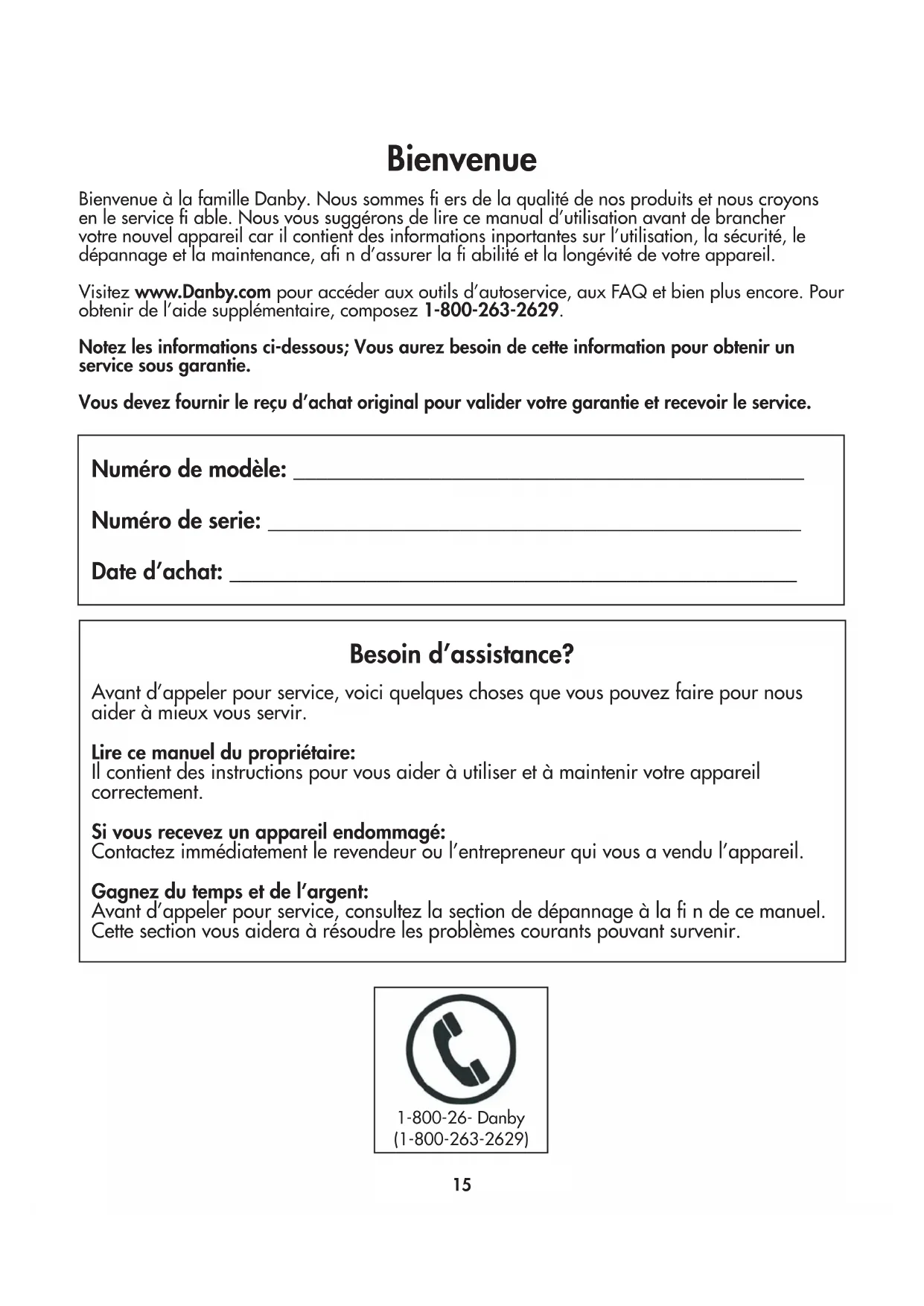 This quality product is warranted to be free from manufacturer’s defects in material and workmanship, provided that the unit is used under the normal operating conditions intended by the manufacturer. This warranty is available only to the person to whom the unit was originally sold by Danby Products Limited (Canada) or Danby Products Inc. (U.S.A.) (hereafter “Danby”) or by an authorized distributor of Danby, and is non-transferable.TERMS OF WARRANTY Plastic parts are warranted for thirty (30) days from the date of purchase, with no extensions provided. Nothing within this warranty shall imply that Danby will be responsible or liable for any spoilage or damage to food or other contents of this appliance, whether due to any defect of the appliance, or its use, whether proper or improper.EXCLUSIONS Save as herein provided, by Danby, there are no other warranties, conditions, representations or guarantees, express or implied, made or intended by Danby or its authorized distributors and all other warranties, conditions, representations or guarantees, including any warranties, conditions, representations or guarantees under any Sale of Goods Act or like legislation or statute is hereby expressly excluded. Save as herein provided, Danby shall not be responsible for any damages to persons or property, including the unit itself, howsoever caused or any consequential damages arising from the malfunction of the unit and by the purchase of the unit, the purchaser does hereby agree to indemnify and hold harmless Danby from any claim for damages to persons or property caused by the unit.GENERAL PROVISIONS No warranty or insurance herein contained or set out shall apply when damage or repair is caused by any of the following: 1) Power failure.2) Damage in transit or when moving the appliance.3) Improper power supply such as low voltage, defective house wiring or inadequate fuses. 4) Accident, alteration, abuse or misuse of the appliance such as inadequate air circulation in the room or abnormal operating conditions (ie. extremely high or low room temperature).5) Use for commercial or industrial purposes (ie. If the appliance is not installed in a domestic residence). 6) Fire, water damage, theft, war, riot, hostility, acts of God such as hurricanes, floods etc.7) Service calls resulting in customer education. 8) Improper Installation (ie. Building-in of a free standing appliance or using an appliance outdoors that is not approved for outdoor application, including but not limited to: garages, patios, porches or anywhere that is not properly insulated or climate controlled). Proof of purchase date will be required for warranty claims; retain bills of sale. In the event that warranty service is required, present the proof of purchase to our authorized service depot. Warranty Service In Home Danby Products Limited PO Box 1778, Guelph, Ontario, Canada N1H 6Z9 Telephone: (519) 837-0920 FAX: (519) 837-0449 Danby Products Inc. PO Box 669, Findlay, Ohio, U.S.A. 45840 Telephone: (419) 425-8627 FAX: (419) 425-8629 1-800-263-2629 04/1715 Bienvenue Bienvenue à la famille Danby. Nous sommes fi ers de la qualité de nos produits et nous croyons en le service fi able. Nous vous suggérons de lire ce manual d’utilisation avant de brancher votre nouvel appareil car il contient des informations inportantes sur l’utilisation, la sécurité, le dépannage et la maintenance, afi n d’assurer la fi abilité et la longévité de votre appareil. Visitez www.Danby.com pour accéder aux outils d’autoservice, aux FAQ et bien plus encore. Pour obtenir de l’aide supplémentaire, composez 1-800-263-2629. Notez les informations ci-dessous; Vous aurez besoin de cette information pour obtenir un service sous garantie. Vous devez fournir le reçu d’achat original pour valider votre garantie et recevoir le service. Numéro de modèle: _____________________________________________ Numéro de serie: _______________________________________________ Date d’achat: __________________________________________________ Besoin d’assistance? Avant d’appeler pour service, voici quelques choses que vous pouvez faire pour nous aider à mieux vous servir. Lire ce manuel du propriétaire: Il contient des instructions pour vous aider à utiliser et à maintenir votre appareil correctement. Si vous recevez un appareil endommagé: Contactez immédiatement le revendeur ou l’entrepreneur qui vous a vendu l’appareil. Gagnez du temps et de l’argent: Avant d’appeler pour service, consultez la section de dépannage à la fi n de ce manuel. Cette section vous aidera à résoudre les problèmes courants pouvant survenir. 1-800-26- Danby(1-800-263-2629)EXIGENCES DE SÉCURITÉ Cet appareil n’est pas destiné à être utilisé par des personnes (y compris des enfants) dont les capacités physiques, sensorielles ou mentales peuvent être différentes ou réduites, ou qui n’ont pas d’expérience ou de connaissances, à moins que ces personnes ne soient surveillées ou formées pour faire fonctionner l’appareil par une personne responsable de leur sécurité. Les enfants devraient être surveillés pour s’assurer qu’ils ne jouent pas avec l’appareil. Pour éviter tout risque de choc électrique, ne pas utiliser cet appareil dans une zone susceptible d’accumuler de l’eau stagnante. Si cette condition se développe, débranchez l’alimentation avant de pénétrer dans l’eau. Ne pas stocker ou utiliser des matériaux combustibles tels que de l’essence ou d’autres vapeurs ou liquides infl ammables à proximité de ce ou d’un autre appareil. Ne pas insérer de doigts ou d’autres objets dans des grilles ou des ouvertures dans l’appareil. Ne pas couvrir ou bloquer les ouvertures d’admission et d’échappement. N’utilisez pas l’appareil sans le fi ltre installé. N’utilisez pas l’appareil à proximité de sources de chaleur. Cet appareil est destiné uniquement à des applications résidentielles et inté