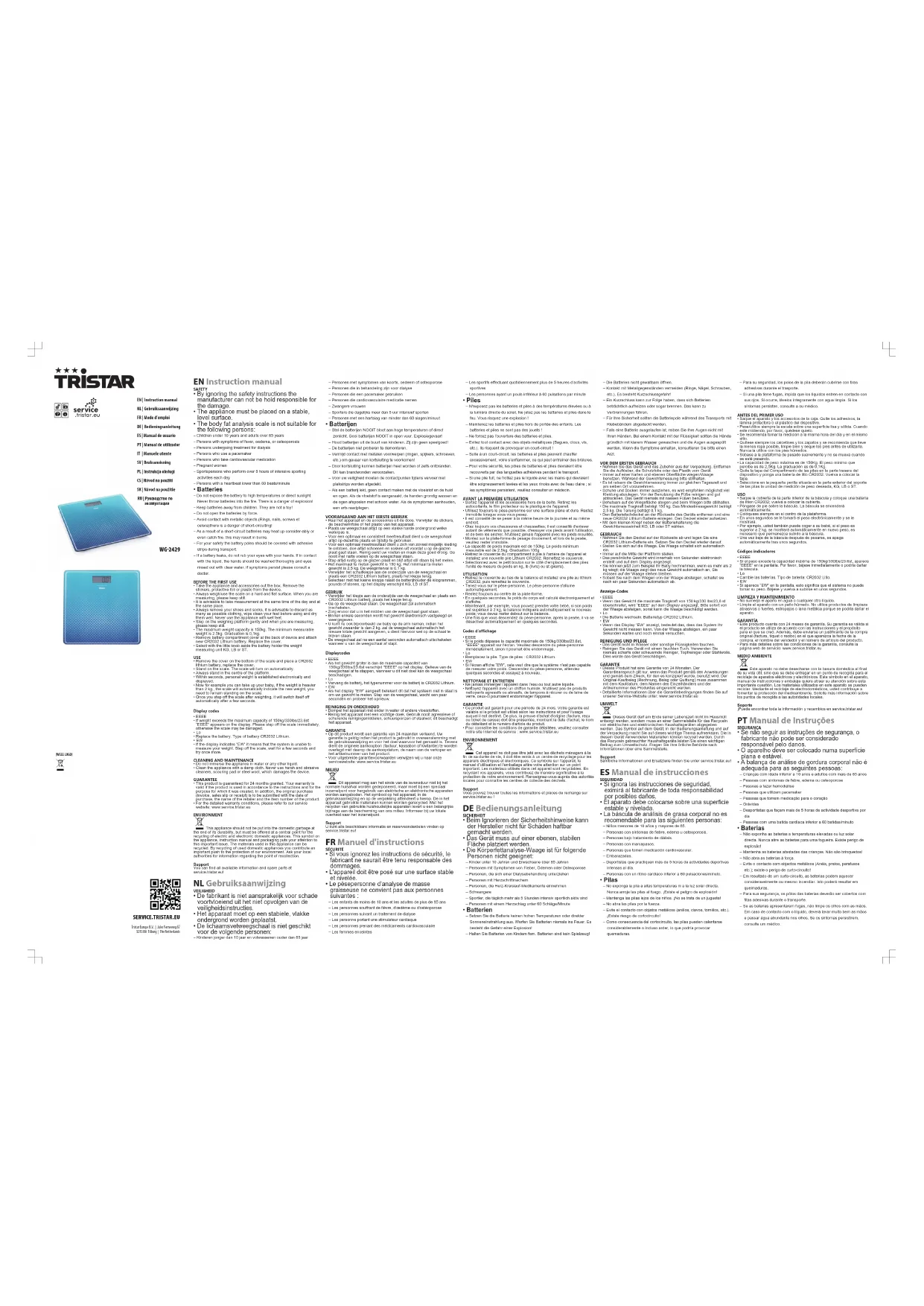 - Si l'écran affiche “EW”, cela veut dire que le système n'est pas capablede mesurer votre poids. Descendez du pèse-personne, attendezquelques secondes et essayez à nouveau.NETTOYAGE ET ENTRETIEN• Ne jamais immerger l’appareil dans l’eau ou tout autre liquide.• Nettoyez l'appareil avec un chiffon humide. N'utilisez pas de produitsnettoyants agressifs ou abrasifs, de tampons à récurer ou de laine deverre, ceux-ci pourraient endommager l'appareil.GARANTIE• Ce produit est garanti pour une période de 24 mois. Votre garantie estvalable si le produit est utilisé selon les instructions et pour l'usageauquel il est destiné. De plus, la preuve d'achat d'origine (facture, reçuou ticket de caisse) doit être présentée, montrant la date d'achat, le nomdu détaillant et le numéro d'article du produit.• Pour connaître les conditions de garantie détaillées, veuillez consulternotre site Internet de service: www.service.tristar.euENVIRONNEMENTCet appareil ne doit pas être jeté avec les déchets ménagers à lafin de sa durée de vie, il doit être remis à un centre de recyclage pour lesappareils électriques et électroniques. Ce symbole sur l'appareil, lemanuel d'utilisation et l'emballage attire votre attention sur un pointimportant. Les matériaux utilisés dans cet appareil sont recyclables. Enrecyclant vos appareils, vous contribuez de manière significative à laprotection de notre environnement. Renseignez-vous auprès des autoritéslocales pour connaître les centres de collecte des déchets.SupportVous pouvez trouver toutes les informations et pièces de rechange surservice.tristar.eu! DEBedienungsanleitung SICHERHEIT