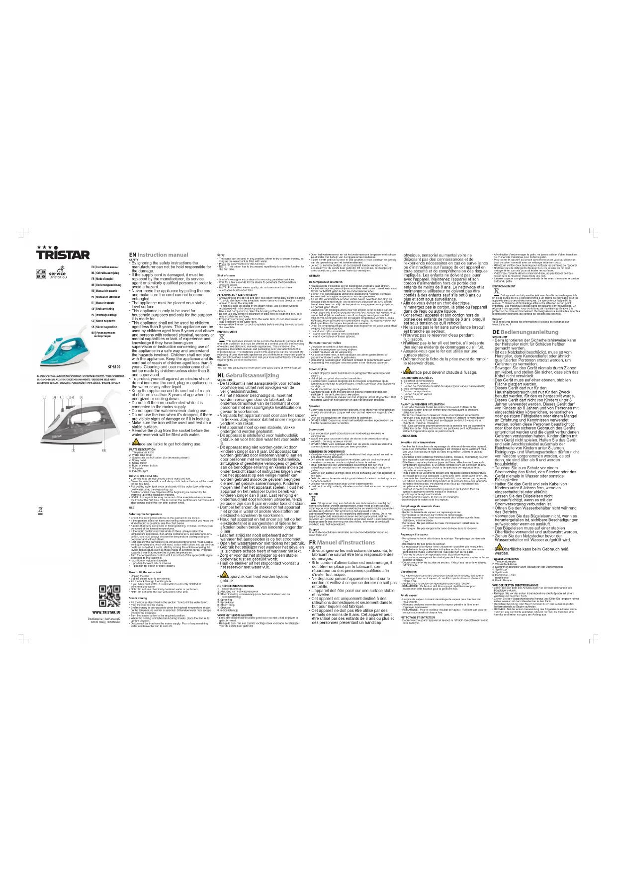 - La surface peut devenir chaude à l'usage. DESCRIPTION DES PIÈCES1. Sélecteur de température2. Couvercle du réservoir d’eau3. Bouton de commande du débit de vapeur (pour vapeur décroissante)4. Tête du vaporisateur5. Bouton de vaporisation6. Bouton du jet de vapeur7. Semelle8. Témoin lumineuxAVANT LA PREMIÈRE UTILISATION• Lisez attentivement toutes les instructions avant d’utiliser le fer.• Nettoyez le patin avec un chiffon doux humide avant la premièreutilisation du fer.• Retirez le couvercle du réservoir d’eau et remplissez lentement leréservoir d’eau avec de l’eau propre froide en utilisant le verre doseur.• Une odeur ou de la fumée peut se dégager au début à cause de lachauffe du matériau d’isolation.• NB: Des particules peuvent provenir de la semelle lors de la premièreutilisation du fer. Cela est normal ; les particules sont inoffensives etarrêtent d’apparaître après un petit moment.UTILISATIONSélection de la température• Vérifiez les instructions de repassage du vêtement devant être repassé.• Si aucune instruction de repassage n’est indiquée sur le vêtement maisque vous connaissez le type du tissu en question, utilisez le tableausuivant.• Les tissus ayant certaines finitions (lustrée, froissée, contrastée) peuventêtre repassés aux températures les plus basses.• Si le tissu comporte plusieurs types de fibres, sélectionnez toujours latempérature appropriée, si un article contient 60% de polyester et 40%de coton, il faut toujours choisir la température correspondante aupolyester et sans vapeur.• Triez d’abord les vêtements devant être repassés selon la températurede repassage la plus adéquate: Laine avec laine, coton avec coton, etc.comme le fer chauffe aussi vite qu’il refroidit, commencez par repasserles articles nécessitant la température la plus basse tels ceux fabriquésen fibres synthétiques. Poursuivez avec ceux qui nécessitent lestempératures les plus élevées.• Tournez le bouton de température jusqu’à ce qu’il soit en face dusymbole approprié comme indiqué ci-dessous:• position pour le nylon et l’acétate• position pour les laines, la soie ou les mélanges• position pour le coton ou le lin (vapeur).Remplissage du réservoir d’eau• Débranchez le fer.• Réglez la barrette de vapeur sur repassage à sec.• Remplissez le réservoir par l'orifice de remplissage.• Si votre eau est dure, il est recommandé de n’utiliser que de l’eaudistillée ou déminéralisée.• Remarque: Ne pas utiliser de l’eau chimiquement détartrante ouparfumée.• Remarque: Ne pas ranger le fer avec de l’eau dans le réservoir.Repassage à la vapeur• Remplissez le fer tel décrit dans la rubrique ‘Remplissage du réservoird’eau’.• Branchez le fer à la prise de secteur.• Le repassage à la vapeur n’est uniquement possible que lorsque lestempératures les plus élevées indiquées sur le bouton de commandesont sélectionnées. Autrement de l’eau peut fuir par le patin.• Tournez le bouton de vaporisation sur la position requise.• Lorsque le repassage est terminé et pendant les pauses, mettez le fer enposition verticale.• Débranchez le fer de la prise de secteur. Videz l’eau restante et laissezrefroidir le fer.Vaporisation• Le vaporisateur peut être utilisé pour toutes les fonctions, soit pour lerepassage à sec ou à vapeur, à condition que le réservoir d’eau soitrempli d’eau.• Appuyez sur le bouton de vaporisation pour cette fonction• REMARQUE: Ce bouton doit être appuyé répétitivement pourenclencher cette fonction pour la première fois.Jet de vapeur• Les jets de vapeur donnent davantage de vapeur pour ôter les plisrécalcitrants.• Attendez quelques secondes que la vapeur pénètre la fibre avantd’appuyer à nouveau.• REMARQUE: Pour le meilleur résultat de vapeur, n’utilisez pas plus detrois jets successifs à chaque fois.NETTOYAGE ET ENTRETIEN• Débranchez toujours l’appareil et laissez-le refroidir complètement avantde le nettoyer.• Afin d’éviter d'endommager le patin, ne jamais utiliser d'objet tranchantou d'ustensile métallique pour frotter le patin.• Pour retirer le calcaire accumulé dans les trous de vapeur, utilisez unbout de coton humecté avec un mélange détartrant doux.• Utilisez un chiffon doux humide pour nettoyer les surfaces de l’appareil.• N’utilisez pas de détergents décapants ou de la laine de fer pournettoyer le fer car cela pourrait érafler les surfaces.• Videz l’eau restante dans le réservoir d’eau, ne pas laisser de l’eaurester dans le réservoir d’eau toute une nuit.• Laissez toujours complètement refroidir le fer avant d’enrouler le cordonautour du patin.ENVIRONNEMENTCet appareil ne doit pas être jeté avec les déchets ménagers à lafin de sa durée de vie, il doit être remis à un centre de recyclage pour lesappareils électriques et électroniques. Ce symbole sur l'appareil, lemanuel d'utilisation et l'emballage attire votre attention sur un pointimportant. Les matériaux utilisés dans cet appareil sont recyclables. Enrecyclant vos appareils, vous contribuez de manière significative à laprotection de notre environnement. Renseignez-vous auprès des autoritéslocales pour connaître les centres de collecte des déchets.SupportVous retrouvez toutes les informations et pièces de rechange surwww.tristar.eu! DEBedienungsanleitung SICHERHEIT