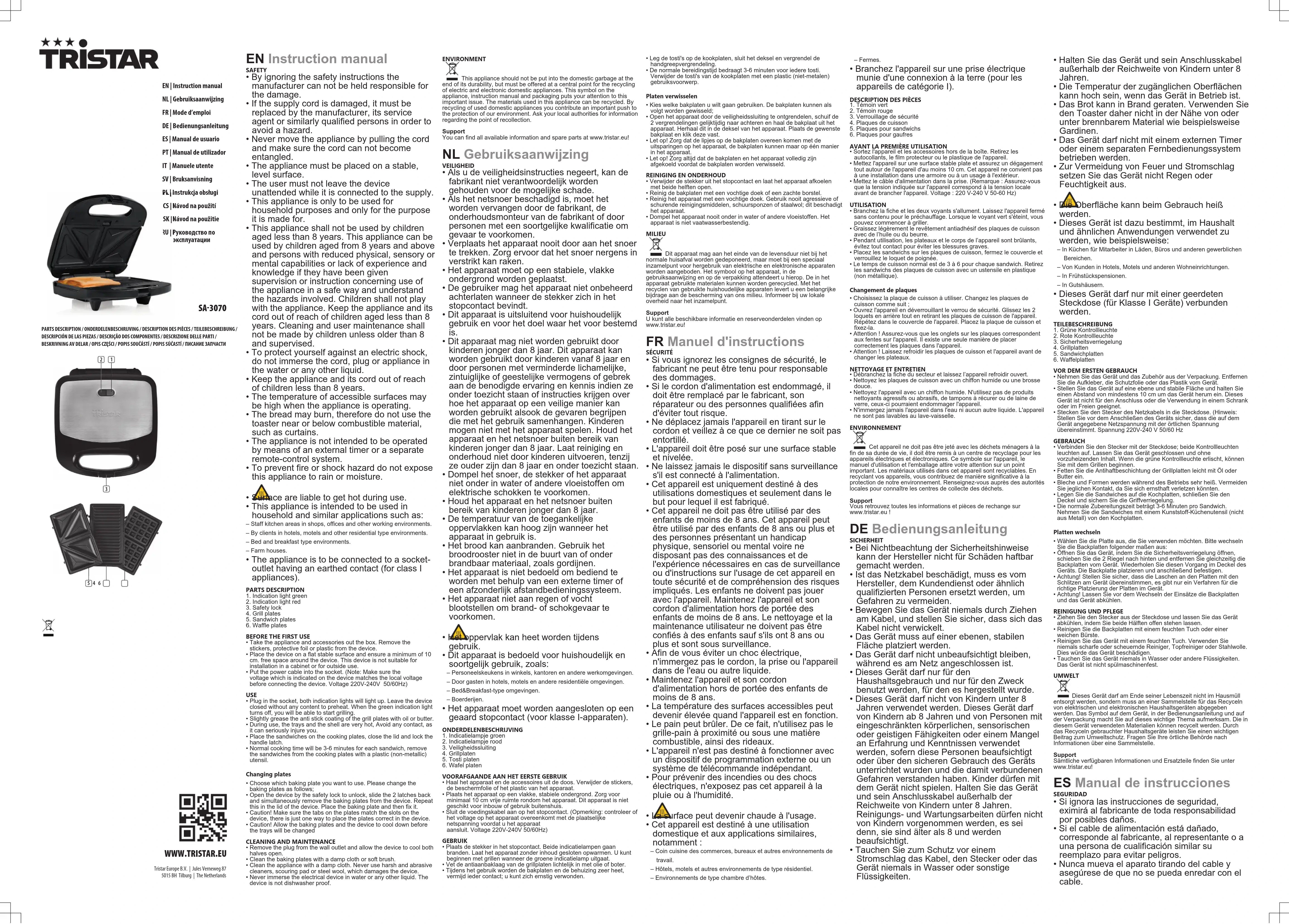- Branchez l'appareil sur une prise électrique munie d'une connexion à la terre (pour les appareils de catégorie I). DESCRIPTION DES PIÈCES1. Témoin vert2. Témoin rouge3. Verrouillage de sécurité4. Plaques de cuisson5. Plaques pour sandwichs6. Plaques pour gaufresAVANT LA PREMIÈRE UTILISATION• Sortez l'appareil et les accessoires hors de la boîte.Retirez lesautocollants, le film protecteur ou le plastique de l'appareil.• Mettez l'appareil sur une surface stable plate et assurez un dégagementtout autour de l'appareil d'au moins 10 cm. Cet appareil ne convient pasà une installation dans une armoire ou à un usage à l'extérieur.• Mettez le câble d'alimentation dans la prise.(Remarque : Assurez-vousque la tension indiquée sur l'appareil correspond à la tension localeavant de brancher l'appareil.Voltage : 220 V-240 V 50-60 Hz)UTILISATION• Branchez la fiche et les deux voyants s'allument. Laissez l'appareil fermésans contenu pour le préchauffage. Lorsque le voyant vert s'éteint, vouspouvez commencer à griller.• Graissez légèrement le revêtement antiadhésif des plaques de cuissonavec de l’huile ou du beurre.• Pendant utilisation, les plateaux et le corps de l’appareil sont brûlants,évitez tout contact pour éviter les blessures graves.• Placez les sandwichs sur les plaques de cuisson, fermez le couvercle etverrouillez le loquet de poignée.• Le temps de cuisson normal est de 3 à 6 pour chaque sandwich. Retirezles sandwichs des plaques de cuisson avec un ustensile en plastique(non métallique).Changement de plaques• Choisissez la plaque de cuisson à utiliser. Changez les plaques decuisson comme suit ;• Ouvrez l'appareil en déverrouillant le verrou de sécurité. Glissez les 2loquets en arrière tout en retirant les plaques de cuisson de l'appareil.Répétez dans le couvercle de l'appareil. Placez la plaque de cuisson etfixez-la.• Attention! Assurez-vous que les onglets sur les plaques correspondentaux fentes sur l'appareil. Il existe une seule manière de placercorrectement les plaques dans l'appareil.• Attention! Laissez refroidir les plaques de cuisson et l'appareil avant dechanger les plateaux.NETTOYAGE ET ENTRETIEN• Débranchez la fiche du secteur et laissez l’appareil refroidir ouvert.• Nettoyez les plaques de cuisson avec un chiffon humide ou une brossedouce.• Nettoyez l'appareil avec un chiffon humide. N'utilisez pas de produitsnettoyants agressifs ou abrasifs, de tampons à récurer ou de laine deverre, ceux-ci pourraient endommager l'appareil.• N'immergez jamais l'appareil dans l'eau ni aucun autre liquide. L'appareilne sont pas lavables au lave-vaisselle.ENVIRONNEMENTCet appareil ne doit pas être jeté avec les déchets ménagers à lafin de sa durée de vie, il doit être remis à un centre de recyclage pour lesappareils électriques et électroniques. Ce symbole sur l'appareil, lemanuel d'utilisation et l'emballage attire votre attention sur un pointimportant. Les matériaux utilisés dans cet appareil sont recyclables. Enrecyclant vos appareils, vous contribuez de manière significative à laprotection de notre environnement. Renseignez-vous auprès des autoritéslocales pour connaître les centres de collecte des déchets.SupportVous retrouvez toutes les informations et pièces de rechange surwww.tristar.eu! DEBedienungsanleitung SICHERHEIT