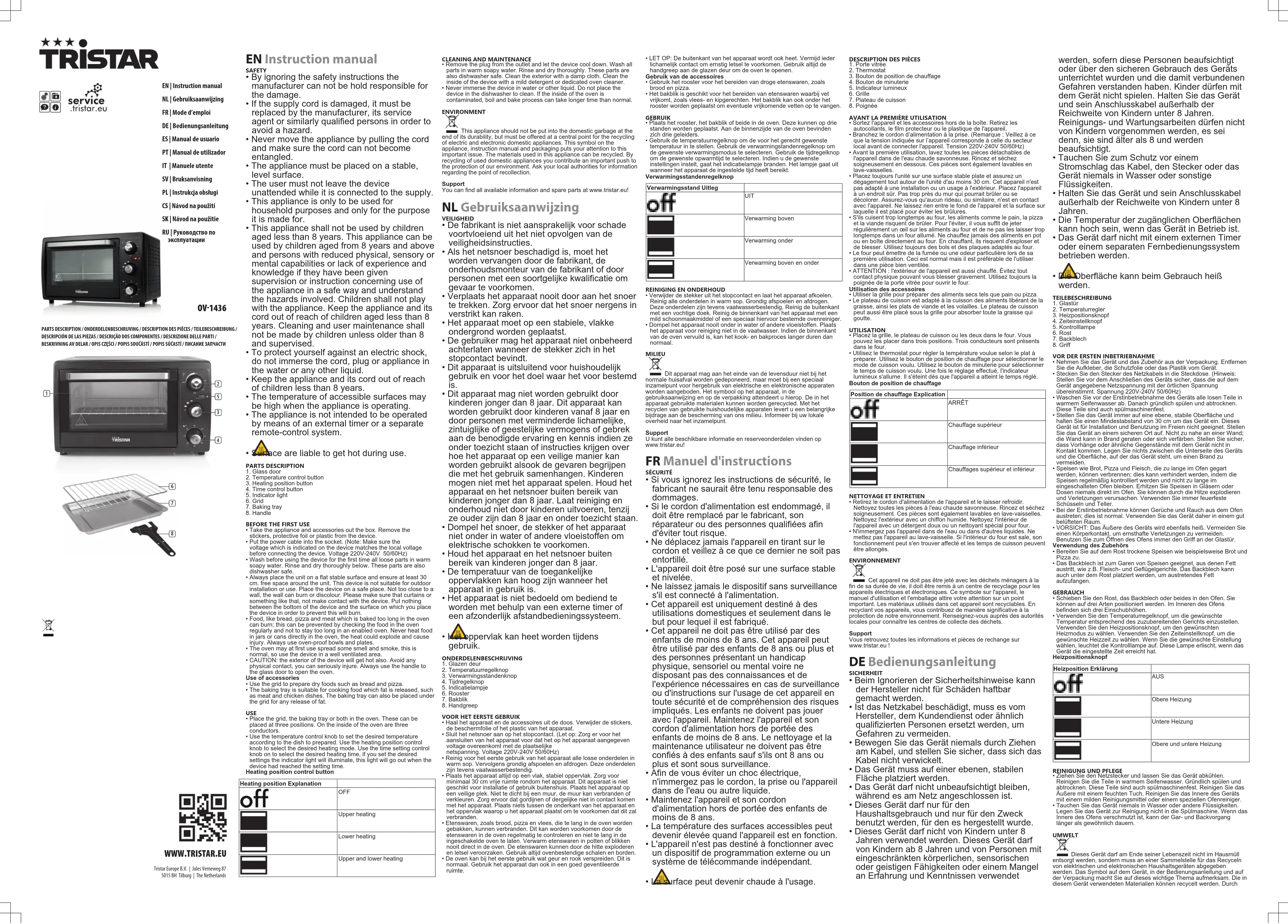 - La surface peut devenir chaude à l'usage. DESCRIPTION DES PIÈCES1. Porte vitrée2. Thermostat3. Bouton de position de chauffage4. Bouton de minuterie5. Indicateur lumineux6. Grille7. Plateau de cuisson8. PoignéeAVANT LA PREMIÈRE UTILISATION• Sortez l'appareil et les accessoires hors de la boîte.Retirez lesautocollants, le film protecteur ou le plastique de l'appareil.• Branchez le cordon d’alimentation à la prise.(Remarque: Veillez à ceque la tension indiquée sur l’appareil corresponde à celle du secteurlocal avant de connecter l'appareil.Tension220V-240V 50/60Hz)• Avant la première utilisation, lavez toutes les pièces détachables del'appareil dans de l'eau chaude savonneuse. Rincez et séchezsoigneusement en dessous. Ces pièces sont également lavables enlave-vaisselles.• Placez toujours l'unité sur une surface stable plate et assurez undégagement tout autour de l'unité d'au moins 30 cm. Cet appareil n'estpas adapté à une installation ou un usage à l'extérieur. Placez l'appareilà un endroit sûr. Pas trop près du mur qui pourrait brûler ou sedécolorer. Assurez-vous qu'aucun rideau, ou similaire, n'est en contactavec l'appareil. Ne laissez rien entre le fond de l'appareil et la surface surlaquelle il est placé pour éviter les brûlures.• S'ils cuisent trop longtemps au four, les aliments comme le pain, la pizzaet la viande risquent de brûler. Pour l'éviter, il vous suffit de jeterrégulièrement un œil sur les aliments au four et de ne pas les laisser troplongtemps dans un four allumé. Ne chauffez jamais des aliments en potou en boîte directement au four. En chauffant, ils risquent d'exploser etde blesser. Utilisez toujours des bols et des plaques adaptés au four.• Le four peut émettre de la fumée ou une odeur particulière lors de sapremière utilisation. Ceci est normal mais il est préférable de l'utiliserdans une pièce bien ventilée.• ATTENTION : l'extérieur de l'appareil est aussi chauffé. Évitez toutcontact physique pouvant vous blesser gravement. Utilisez toujours lapoignée de la porte vitrée pour ouvrir le four.Utilisation des accessoires• Utiliser la grille pour préparer des aliments secs tels que pain ou pizza.• Le plateau de cuisson est adapté à la cuisson des aliments libérant de lagraisse, ainsi les plats de viande et les volailles. Le plateau de cuissonpeut aussi être placé sous la grille pour absorber toute la graisse quigoutte.UTILISATION• Placez la grille, le plateau de cuisson ou les deux dans le four. Vouspouvez les placer dans trois positions. Trois conducteurs sont présentsdans le four.• Utilisez le thermostat pour régler la température voulue selon le plat àpréparer. Utilisez le bouton de position de chauffage pour sélectionner lemode de cuisson voulu. Utilisez le bouton de minuterie pour sélectionnerle temps de cuisson voulu. Une fois le réglage effectué, l'indicateurlumineux s'allume. Il s'éteint dès que l'appareil a atteint le temps réglé.Bouton de position de chauffagePosition de chauffage ExplicationARRÊTChauffage supérieurChauffage inférieurChauffages supérieur et inférieurNETTOYAGE ET ENTRETIEN• Retirez le cordon d'alimentation de l'appareil et le laisser refroidir.Nettoyez toutes les pièces à l'eau chaude savonneuse. Rincez et séchezsoigneusement. Ces pièces sont également lavables en lave-vaisselles.Nettoyez l'extérieur avec un chiffon humide. Nettoyez l'intérieur del'appareil avec un détergent doux ou un nettoyant spécial pour four.• N'immergez pas l'appareil dans de l'eau ou dans d'autres liquides. Nemettez pas l'appareil au lave-vaisselle. Si l'intérieur du four est sale, sonfonctionnement peut s'en trouver affecté et les temps de cuisson peuventêtre allongés.ENVIRONNEMENTCet appareil ne doit pas être jeté avec les déchets ménagers à lafin de sa durée de vie, il doit être remis à un centre de recyclage pour lesappareils électriques et électroniques. Ce symbole sur l'appareil, lemanuel d'utilisation et l'emballage attire votre attention sur un pointimportant. Les matériaux utilisés dans cet appareil sont recyclables. Enrecyclant vos appareils, vous contribuez de manière significative à laprotection de notre environnement. Renseignez-vous auprès des autoritéslocales pour connaître les centres de collecte des déchets.SupportVous retrouvez toutes les informations et pièces de rechange surwww.tristar.eu! DEBedienungsanleitung SICHERHEIT
