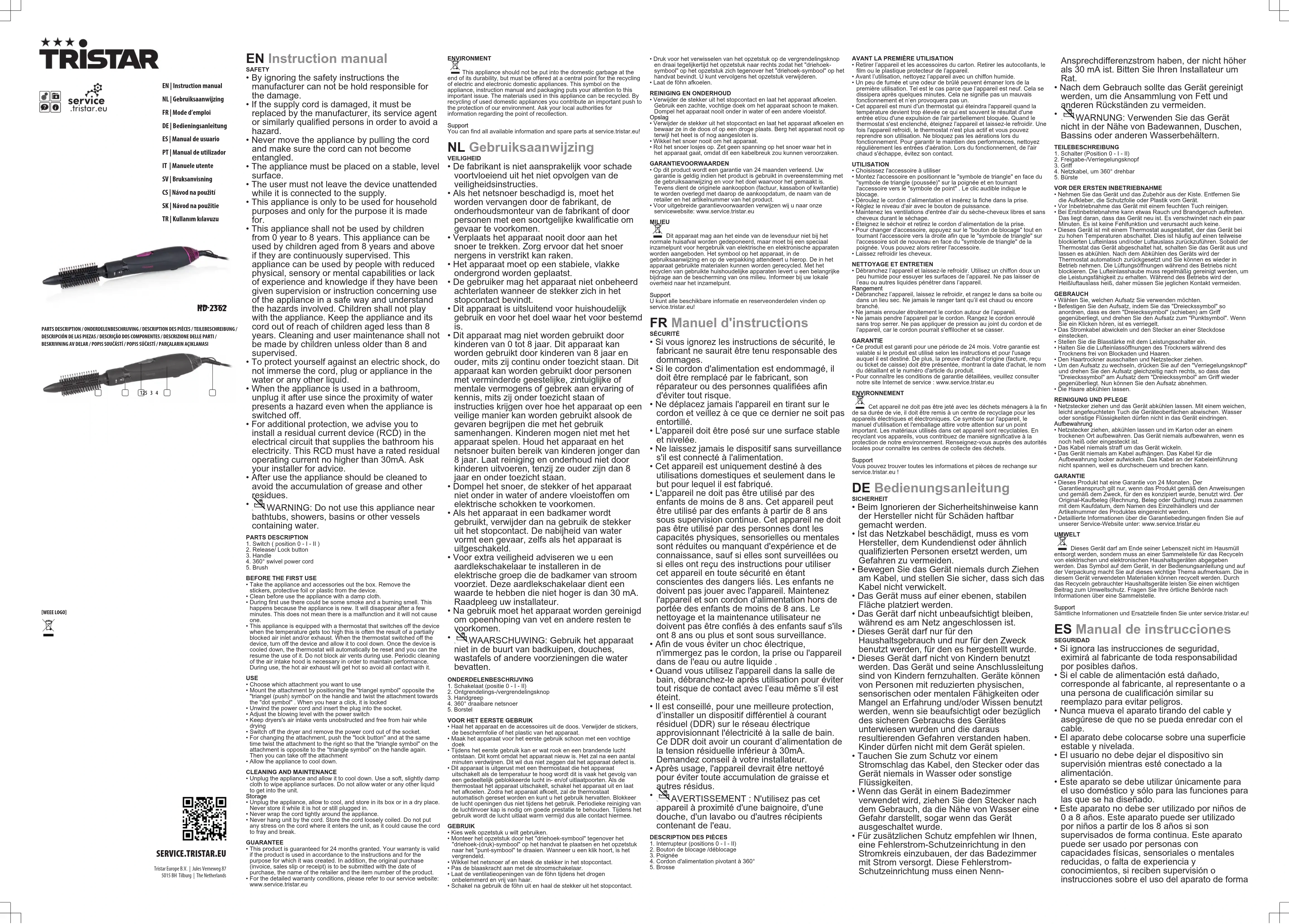 appareil à proximité d'une baignoire, d'une douche, d'un lavabo ou d'autres récipients contenant de l'eau. DESCRIPTIONDESPIÈCES1. Interrupteur (positions 0 - I - II)2. Bouton de blocage /déblocage3. Poignée4. Cordon d'alimentation pivotant à 360°5. BrosseAVANTLAPREMIÈREUTILISATION• Retirer l’appareil et les accessoires du carton. Retirer les autocollants, lefilm ou le plastique protecteur de l’appareil.• Avant l’utilisation, nettoyez l’appareil avec un chiffon humide.• Un peu de fumée et une odeur de brûlé peuvent émaner lors de lapremière utilisation. Tel est le cas parce que l’appareil est neuf. Cela sedissipera après quelques minutes. Cela ne signifie pas un mauvaisfonctionnement et n’en provoquera pas un.• Cet appareil est muni d'un thermostat qui éteindra l'appareil quand latempérature devient trop élevée ce qui est souvent le résultat d'uneentrée et/ou d'une expulsion de l'air partiellement bloquée. Quand lethermostat s'est enclenché, éteignez l'appareil et laissez-le refroidir. Unefois l'appareil refroidi, le thermostat n'est plus actif et vous pouvezreprendre son utilisation. Ne bloquez pas les aérations lors dufonctionnement. Pour garantir le maintien des performances, nettoyezrégulièrement les entrées d'aération. Lors du fonctionnement, de l'airchaud s'échappe, évitez son contact.UTILISATION• Choisissez l'accessoire à utiliser• Montez l'accessoire en positionnant le "symbole de triangle" en face du"symbole de triangle (poussée)" sur la poignée et en tournantl'accessoire vers le "symbole de point" . Le clic audible indique leblocage.• Déroulez le cordon d’alimentation et insérez la fiche dans la prise.• Réglez le niveau d'air avec le bouton de puissance.• Maintenez les ventilations d'entrée d'air du sèche-cheveux libres et sanscheveux durant le séchage.• Eteignez le séchoir et retirez le cordon d’alimentation de la prise.• Pour changer d'accessoire, appuyez sur le "bouton de blocage" tout entournant l'accessoire vers la droite afin que le "symbole de triangle" surl'accessoire soit de nouveau en face du "symbole de triangle" de lapoignée. Vous pouvez alors retirer l'accessoire.• Laissez refroidir les cheveux.NETTOYAGEETENTRETIEN• Débranchez l’appareil et laissez-le refroidir. Utilisez un chiffon doux unpeu humide pour essuyer les surfaces de l’appareil. Ne pas laisser del’eau ou autres liquides pénétrer dans l’appareil.Rangement• Débranchez l’appareil, laissez le refroidir, et rangez le dans sa boite oudans un lieu sec. Ne jamais le ranger tant qu’il est chaud ou encorebranché.• Ne jamais enrouler étroitement le cordon autour de l’appareil.• Ne jamais pendre l’appareil par le cordon. Rangez le cordon enroulésans trop serrer. Ne pas appliquer de pression au joint du cordon et del'appareil, car le cordon pourrait s'effilocher et se casser.GARANTIE• Ce produit est garanti pour une période de 24 mois. Votre garantie estvalable si le produit est utilisé selon les instructions et pour l'usageauquel il est destiné. De plus, la preuve d'achat d'origine (facture, reçuou ticket de caisse) doit être présentée, montrant la date d'achat, le nomdu détaillant et le numéro d'article du produit.• Pour connaître les conditions de garantie détaillées, veuillez consulternotre site Internet de service: www.service.tristar.euENVIRONNEMENT Cet appareil ne doit pas être jeté avec les déchets ménagers à la finde sa durée de vie, il doit être remis à un centre de recyclage pour lesappareils électriques et électroniques. Ce symbole sur l'appareil, lemanuel d'utilisation et l'emballage attire votre attention sur un pointimportant. Les matériaux utilisés dans cet appareil sont recyclables. Enrecyclant vos appareils, vous contribuez de manière significative à laprotection de notre environnement. Renseignez-vous auprès des autoritéslocales pour connaître les centres de collecte des déchets.SupportVous pouvez trouver toutes les informations et pièces de rechange surservice.tristar.eu! DEBedienungsanleitung SICHERHEIT