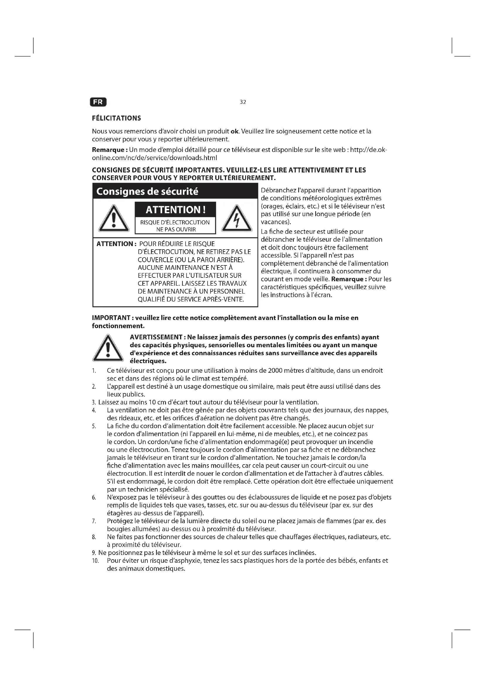 FÉLICITATIONS Nous vous remercions d’avoir choisi un produit ok. Veuillez lire soigneusement cette notice et la conserver pour vous y reporter ultérieurement. Remarque: Un mode d’emploi détaillé pour ce téléviseur est disponible sur le site web: http://de.ok- online.com/nc/de/service/downloads.html CONSIGNES DE SÉCURITÉ IMPORTANTES. VEUILLEZ-LES LIRE ATTENTIVEMENT ET LES CONSERVER POUR VOUS Y REPORTER ULTÉRIEUREMENT. Consignes de sécurité Débranchez l'appareil durant l’apparition de conditions météorologiques extrêmes (orages, éclairs, etc.) et si le téléviseur n'est pas utilisé sur une longue période (en vacances). La che de secteur est utilisée pour débrancher le téléviseur de l'alimentation et doit donc toujours être facilement accessible. Si l'appareil n'est pas complètement débranché de l'alimentation électrique, il continuera à consommer du courant en mode veille. Remarque: Pour les caractéristiques spéciques, veuillez suivre les instructions à l'écran. ATTENTION!