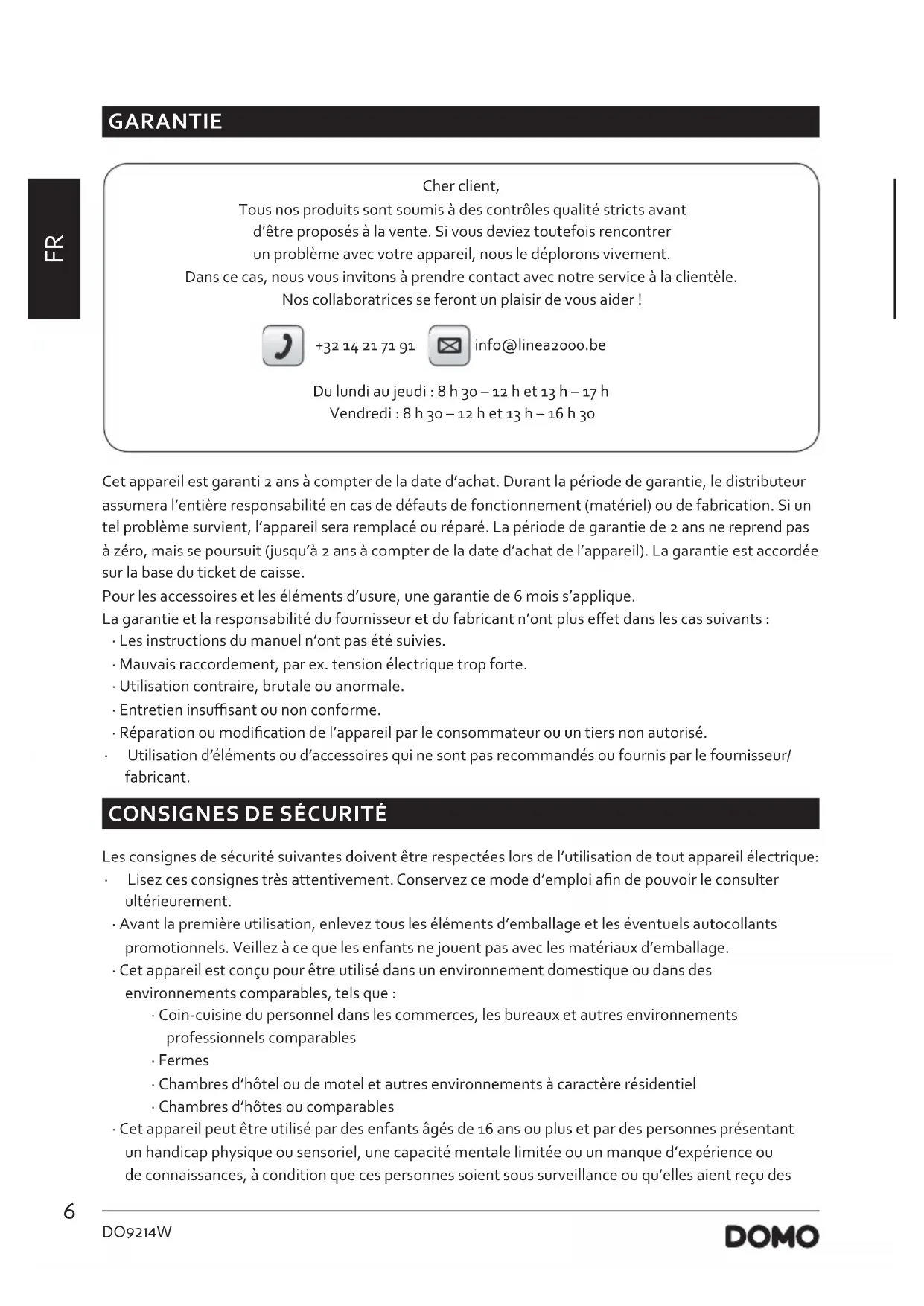GARANTIE Cher client, Tous nos produits sont soumis à des contrôles qualité stricts avant d’être proposés à la vente. Si vous deviez toutefois rencontrer un problème avec votre appareil, nous le déplorons vivement. Dans ce cas, nous vous invitons à prendre contact avec notre service à la clientèle. Nos collaboratrices se feront un plaisir de vous aider ! +32 14 21 71 91 info@linea2000.be Du lundi au jeudi : 8 h 30 – 12 h et 13 h – 17 h Vendredi : 8 h 30 – 12 h et 13 h – 16 h 30 Cet appareil est garanti 2 ans à compter de la date d’achat. Durant la période de garantie, le distributeur assumera l’entière responsabilité en cas de défauts de fonctionnement (matériel) ou de fabrication. Si un tel problème survient, l’appareil sera remplacé ou réparé. La période de garantie de 2 ans ne reprend pas à zéro, mais se poursuit (jusqu’à 2 ans à compter de la date d’achat de l’appareil). La garantie est accordée sur la base du ticket de caisse. Pour les accessoires et les éléments d’usure, une garantie de 6 mois s’applique. La garantie et la responsabilité du fournisseur et du fabricant n’ont plus eet dans les cas suivants :