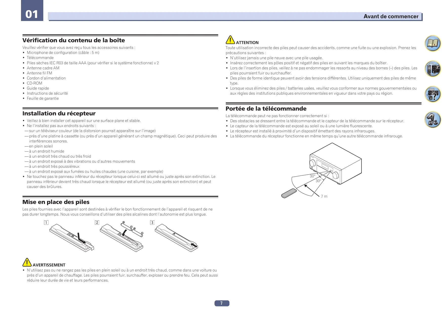 Avant de commencer Vérification du contenu de la boîte ATTENTION Veuillez vérifier que vous avez reçu tous les accessoires suivants : ! Microphone de configuration (câble : 5 m) ! Télécommande ! Piles sèches IEC R03 de taille AAA (pour vérifier si le système fonctionne) x 2 ! Antenne cadre AM ! Antenne fil FM ! Cordon d’alimentation ! CD-ROM ! Guide rapide ! Instructions de sécurité ! Feuille de garantie Toute utilisation incorrecte des piles peut causer des accidents, comme une fuite ou une explosion. Prenez les précautions suivantes : ! N’utilisez jamais une pile neuve avec une pile usagée. ! Insérez correctement les pôles positif et négatif des piles en suivant les marques du boîtier. ! Lors de l’insertion des piles, veillez à ne pas endommager les ressorts au niveau des bornes (–) des piles. Les piles pourraient fuir ou surchauffer. ! Des piles de forme identique peuvent avoir des tensions différentes. Utilisez uniquement des piles de même type. ! Lorsque vous éliminez des piles / batteries usées, veuillez vous conformer aux normes gouvernementales ou aux règles des institutions publiques environnementales en vigueur dans votre pays ou région. Portée de la télécommande Installation du récepteur La télécommande peut ne pas fonctionner correctement si : ! Des obstacles se dressent entre la télécommande et le capteur de la télécommande sur le récepteur. ! Le capteur de la télécommande est exposé au soleil ou à une lumière fluorescente. ! Le récepteur est installé à proximité d’un dispositif émettant des rayons infrarouges. ! La télécommande du récepteur fonctionne en même temps qu’une autre télécommande infrarouge. ! Veillez à bien installer cet appareil sur une surface plane et stable. ! Ne l’installez pas aux endroits suivants : — sur un téléviseur couleur (de la distorsion pourrait apparaître sur l’image) — près d’une platine à cassette (ou près d’un appareil générant un champ magnétique). Ceci peut produire des interférences sonores. — en plein soleil — à un endroit humide — à un endroit très chaud ou très froid — à un endroit exposé à des vibrations ou d’autres mouvements — à un endroit très poussiéreux — à un endroit exposé aux fumées ou huiles chaudes (une cuisine, par exemple) ! Ne touchez pas le panneau inférieur du récepteur lorsque celui-ci est allumé ou juste après son extinction. Le panneau inférieur devient très chaud lorsque le récepteur est allumé (ou juste après son extinction) et peut causer des brûlures. 30° 30°