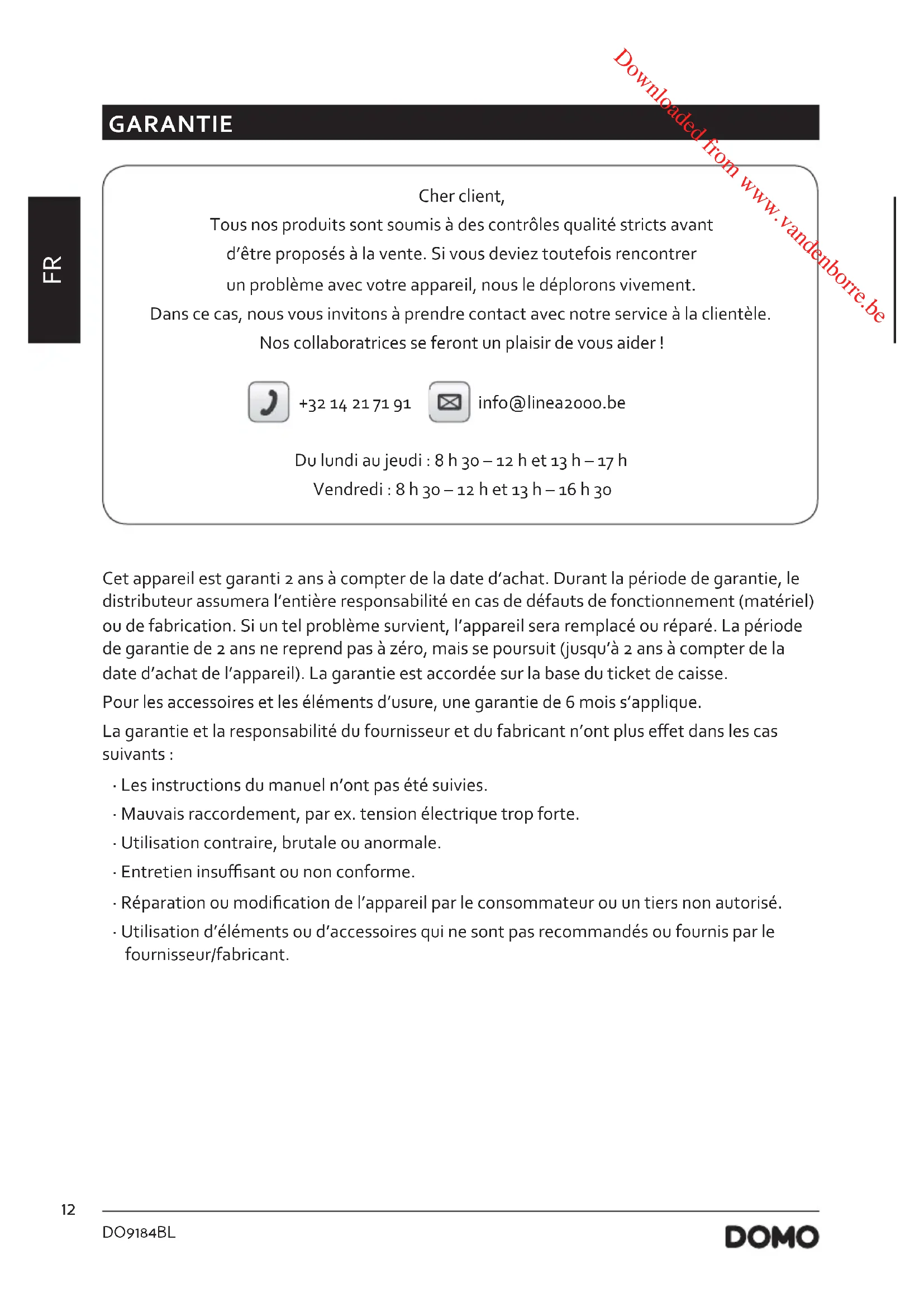 - Les accidents ou dommages causés par le non-respect de ces règles sont à vos propres risques. Ni le fabricant, ni l’importateur, ni le fournisseur ne peuvent, dans ce cas, en être tenus pour responsables. CONSERVEZ CES CONSIGNES POUR POUVOIR LES CONSULTER ULTÉRIEUREMENT Downloaded from www.vandenborre.be15 DO9184BL www.domo-elektro.be