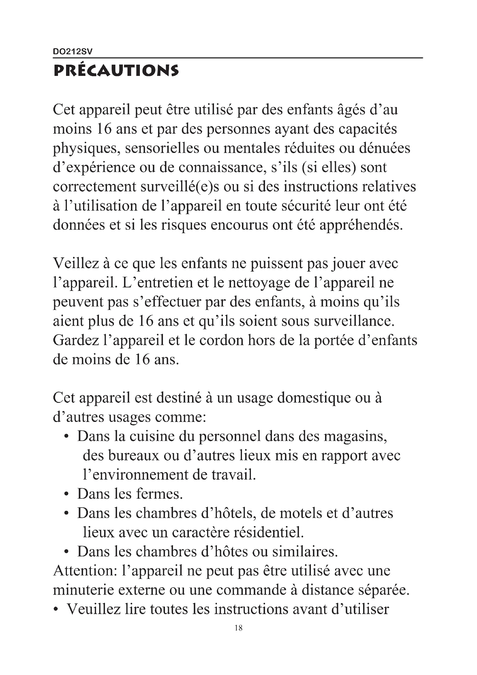 PRÉCAUTIONS Cet appareil peut être utilisé par des enfants âgés d’au moins 16 ans et par des personnes ayant des capacités physiques, sensorielles ou mentales réduites ou dénuées d’expérience ou de connaissance, s’ils (si elles) sont correctement surveillé(e)s ou si des instructions relatives à l’utilisation de l’appareil en toute sécurité leur ont été données et si les risques encourus ont été appréhendés. Veillez à ce que les enfants ne puissent pas jouer avec l’appareil. L’entretien et le nettoyage de l’appareil ne peuvent pas s’effectuer par des enfants, à moins qu’ils aient plus de 16 ans et qu’ils soient sous surveillance. Gardez l’appareil et le cordon hors de la portée d’enfants de moins de 16 ans. Cet appareil est destiné à un usage domestique ou à d’autres usages comme: