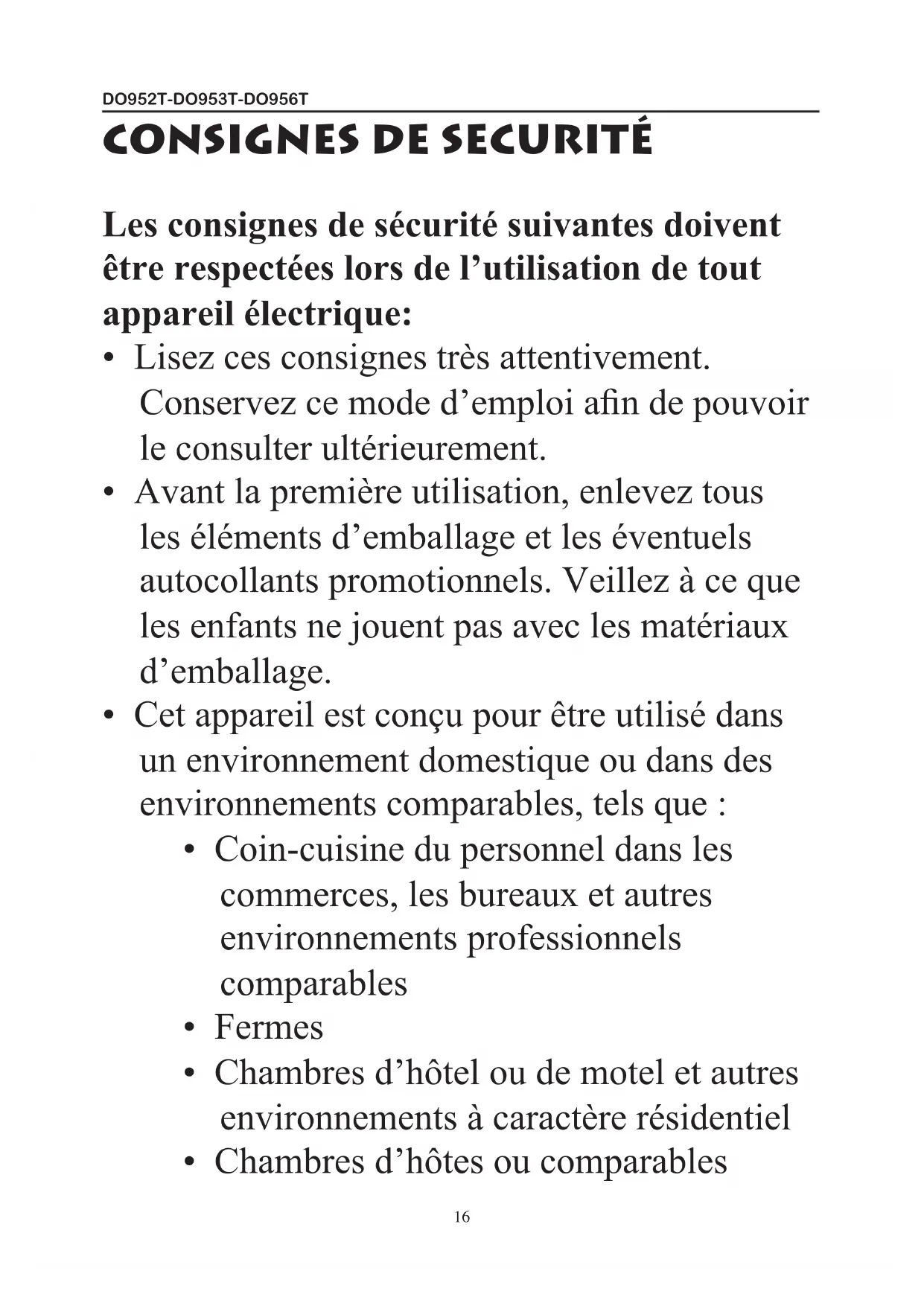 - Cet appareil peut être utilisé par des enfants âgés de 16 ans ou plus et par des personnes présentant un handicap physique ou sensoriel,une capacité mentale limitée ou un manque d’expérience ou de connaissances, à condition que ces personnes soient sous surveillance ou qu’elles aient reçu des instructions sur la manière d’utiliser l’appareil en toute sécurité et qu’elles connaissent les dangers liés à son utilisation. Les enfants ne peuvent pas jouer avec cet appareil. L’entretien et le nettoyage de l’appareil ne peuvent pas être effectués parDO952T-DO953T-DO956T