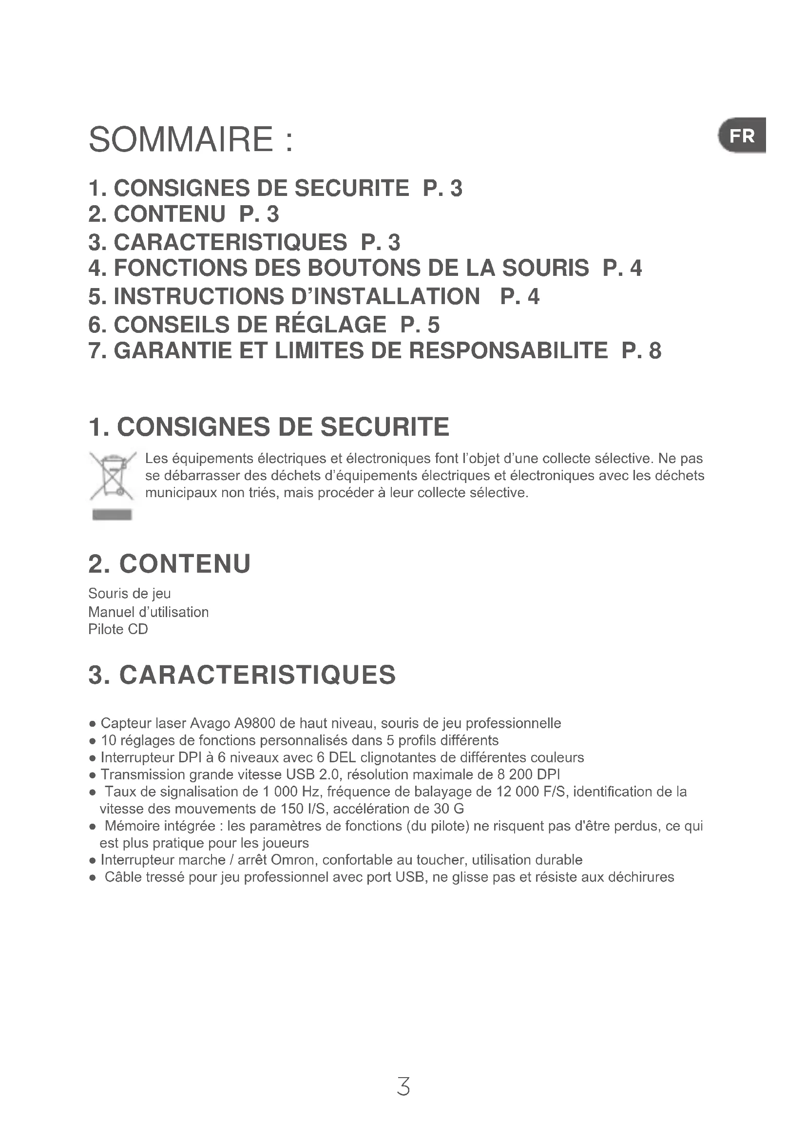 ● Capteur laser Avago A9800 de haut niveau, souris de jeu professionnelle ● 10 réglages de fonctions personnalisés dans 5 prols différents ● Interrupteur DPI à 6 niveaux avec 6 DEL clignotantes de différentes couleurs ● Transmission grande vitesse USB 2.0, résolution maximale de 8 200 DPI ● Taux de signalisation de 1 000 Hz, fréquence de balayage de 12 000 F/S, identication de la vitesse des mouvements de 150 I/S, accélération de 30 G ● Mémoire intégrée : les paramètres de fonctions (du pilote) ne risquent pas d'être perdus, ce qui est plus pratique pour les joueurs ● Interrupteur marche / arrêt Omron, confortable au toucher, utilisation durable ● Câble tressé pour jeu professionnel avec port USB, ne glisse pas et résiste aux déchirures4