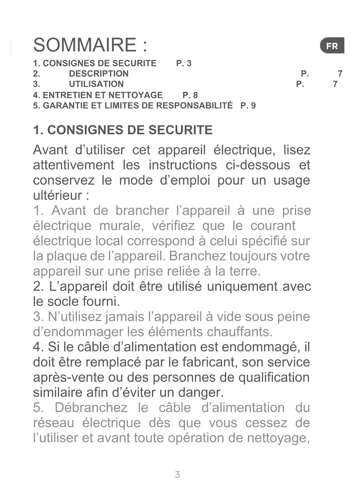 réseau électrique dès que vous cessez de l’utiliser et avant toute opération de nettoyage, SOMMAIRE :