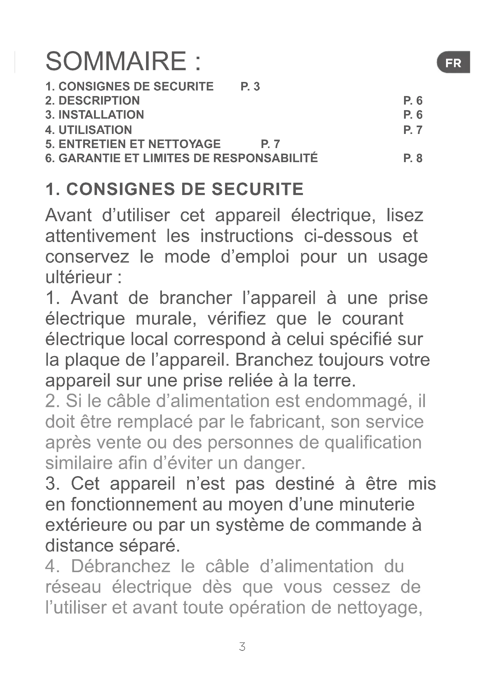 réseau électrique dès que vous cessez de l’utiliser et avant toute opération de nettoyage, SOMMAIRE :