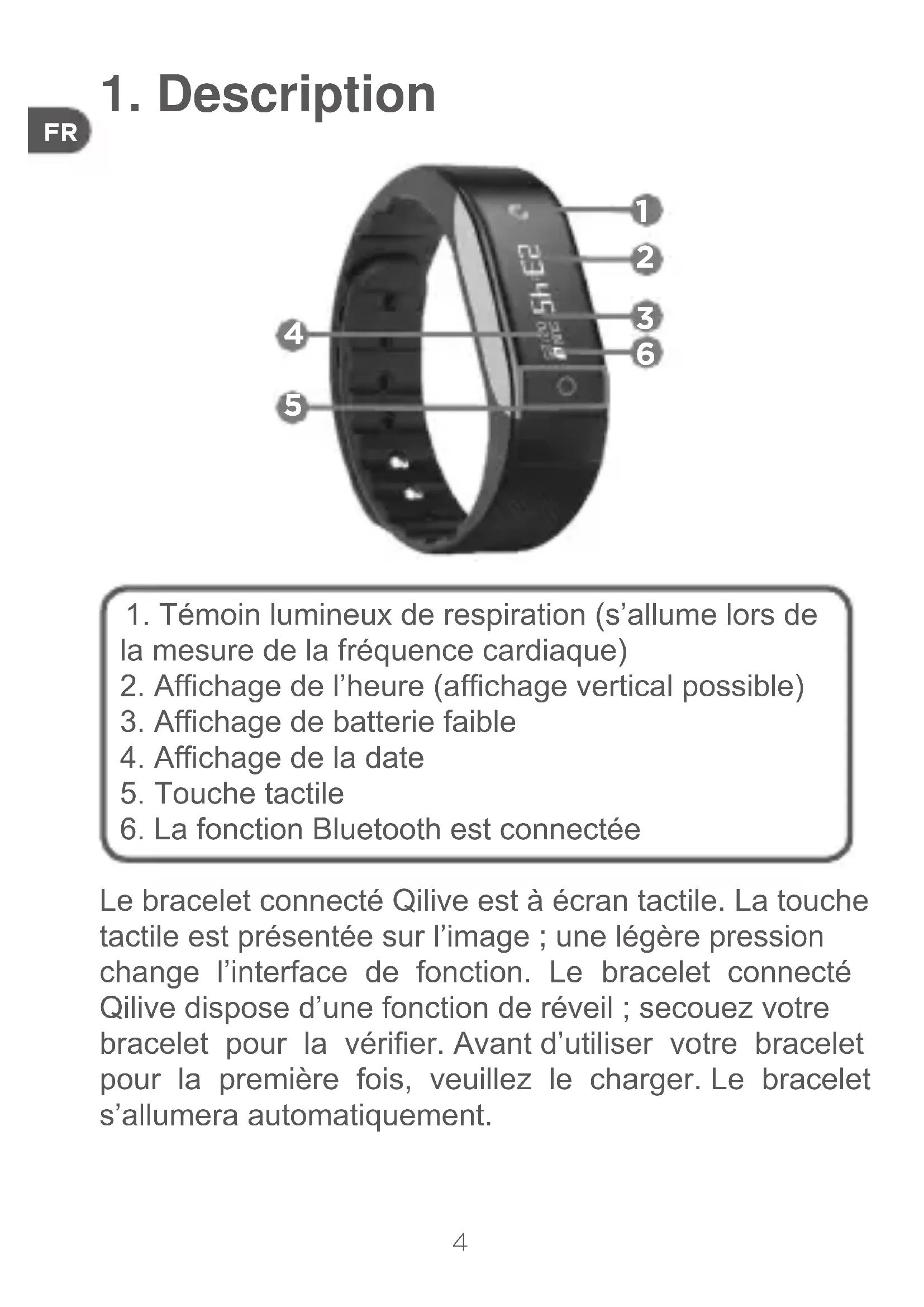 Le bracelet connecté Qilive est à écran tactile. La touche tactile est présentée sur l’image ; une légère pression change l’interface de fonction. Le bracelet connecté Qilive dispose d’une fonction de réveil ; secouez votre bracelet pour la vérier. Avant d’utiliser votre bracelet pour la première fois, veuillez le charger. Le bracelet s’allumera automatiquement.5
