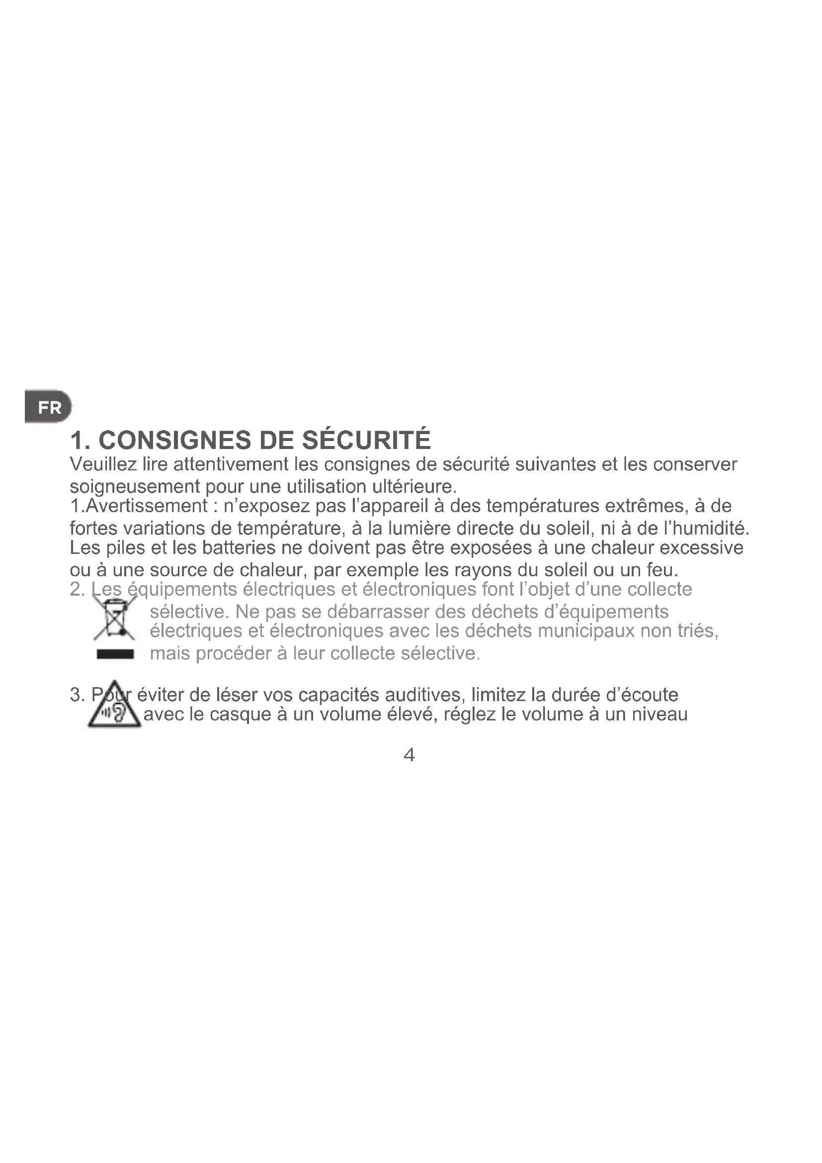 moyen. Plus le volume est élevé, plus vous devez raccourcir le temps d’écoute. 4.Respectez les conseils suivants pendant l’utilisation du casque : -Écoutez la musique à un volume approprié pendant une durée raisonnable. -Pendant l’écoute, réglez le volume progressivement à un niveau qui n’est pas trop élevé. - N’augmentez pas le volume à un niveau tel que vous n’entendez plus les bruits environnants. -Prenez des précautions ou arrêtez temporairement d’utiliser le casque dans les situations potentiellement dangereuses. -Il n’est pas conseillé d’utiliser le casque sur les deux oreilles tout en conduisant. Cela peut même être illégal dans certains pays. - Pour votre sécurité, ne vous laissez pas distraire par la musique ou les appels téléphoniques pendant la conduite ou lorsque vous vous trouvez dans des endroits potentiellement dangereux.FR