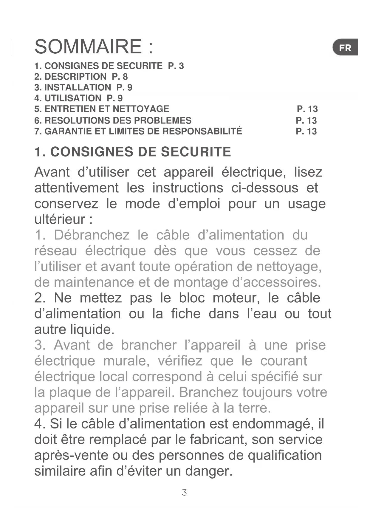 Avant d’utiliser cet appareil électrique, lisez attentivement les instructions ci-dessous et conservez le mode d’emploi pour un usage ultérieur :