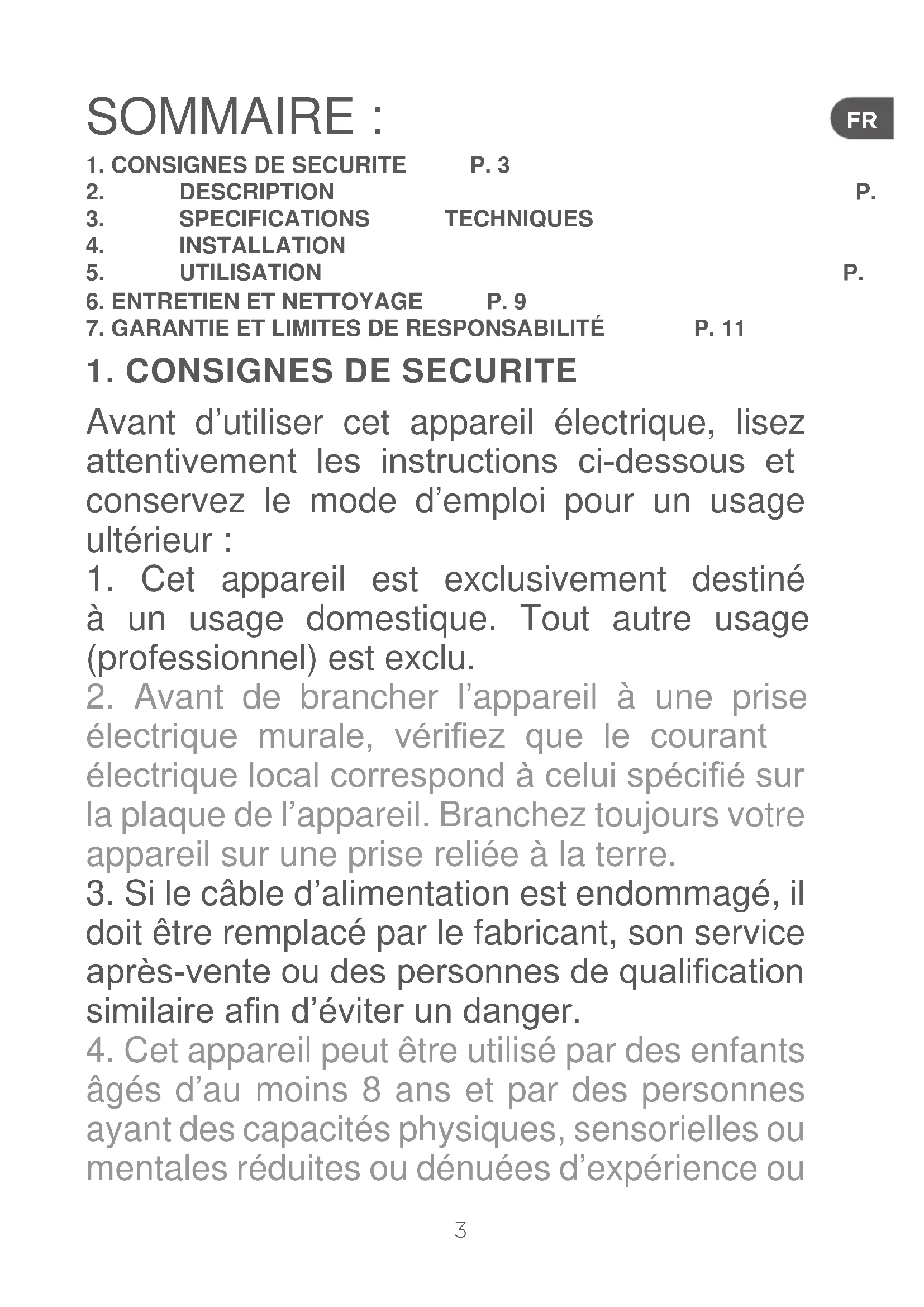 FRde connaissance, s’ils (si elles) sont correctement surveillé(e)s ou si des instructions relatives à l’utilisation de l’appareil en toute sécurité leur ont été données et si les risques encourus ont été appréhendés. Les enfants ne doivent pas jouer avec l’appareil. Le nettoyage et l’entretien par l’usager ne doivent pas être effectués par des enfants sans surveillance.
