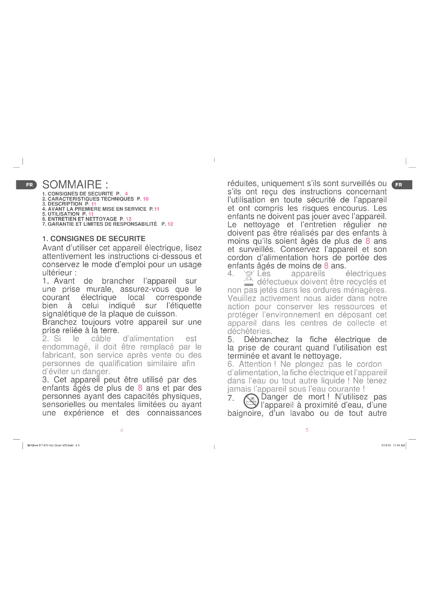 IM-Qilive-871470-Hair Dryer-V05.indd 6-7 5/13/16 11:54 AM8 9 pas de réparer l’appareil vous-même. En cas de dysfonctionnement, les réparations doivent être effectuées par du personnel qualié.