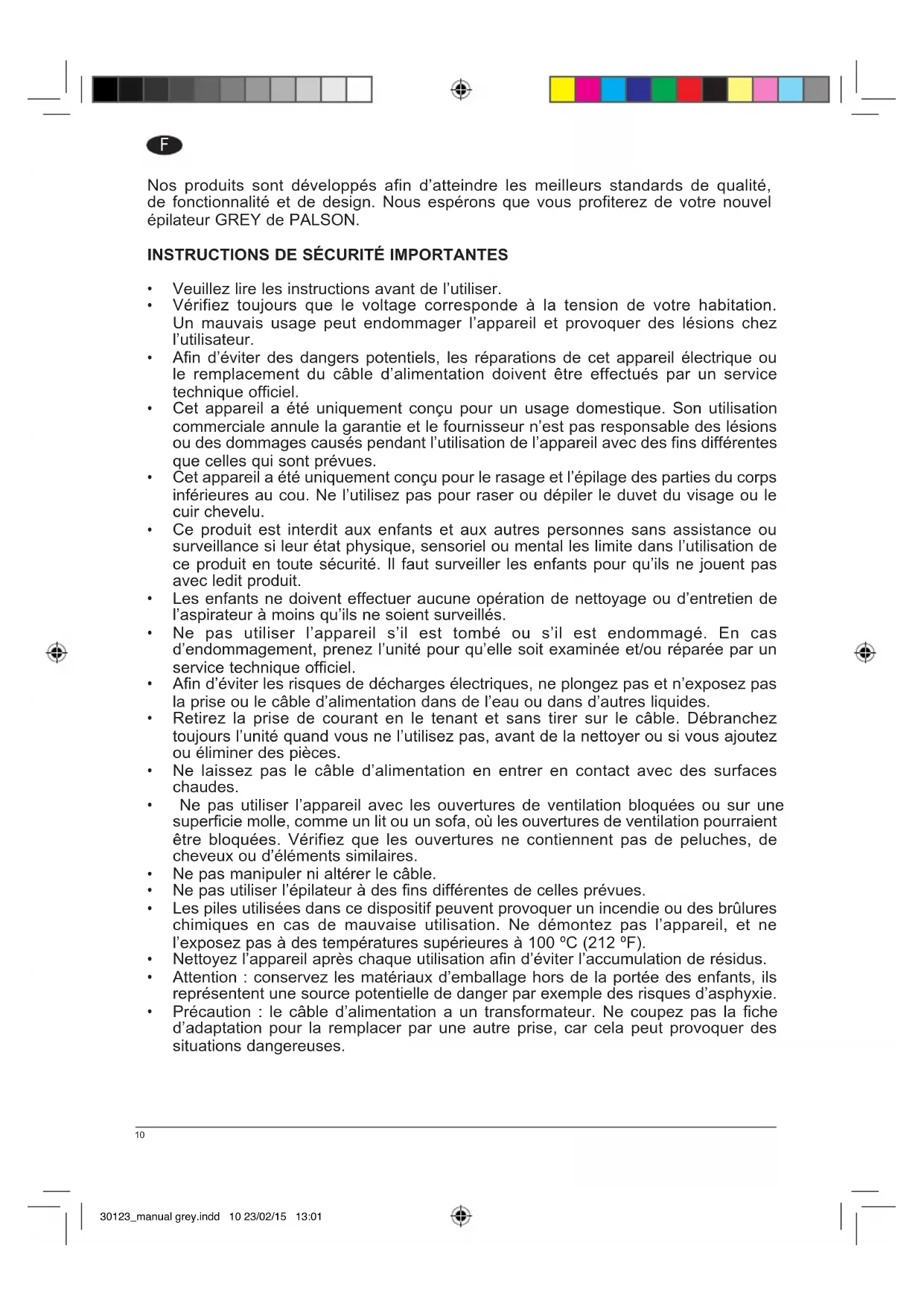 Nos produits sont développés afin d'atteindre les meilleurs standards de qualité, de fonctionnalité et de design. Nous espérons que vous profiterez de votre nouvel épilateur GREY de PALSON.