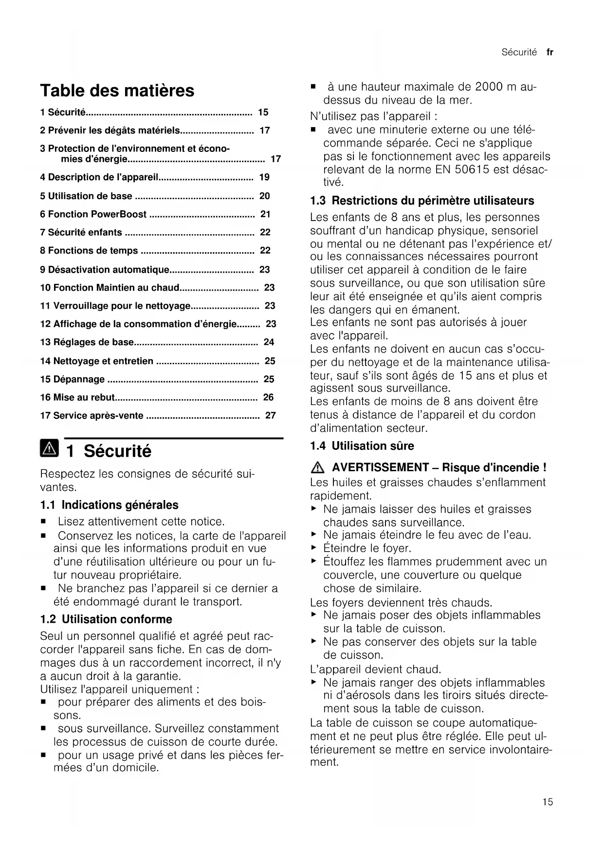 - 17 Service après-vente 1 Sécurité Respectez les consignes de sécurité sui- vantes. 1.1 Indications générales ¡ Lisez attentivement cette notice. ¡ Conservez les notices, la carte de l'appareil ainsi que les informations produit en vue d’une réutilisation ultérieure ou pour un fu- tur nouveau propriétaire. ¡ Ne branchez pas l’appareil si ce dernier a été endommagé durant le transport. 1.2 Utilisation conforme Seul un personnel qualifié et agréé peut rac- corder l'appareil sans fiche. En cas de dom- mages dus à un raccordement incorrect, il n'y a aucun droit à la garantie. Utilisez l'appareil uniquement : ¡ pour préparer des aliments et des bois- sons. ¡ sous surveillance. Surveillez constamment les processus de cuisson de courte durée. ¡ pour un usage privé et dans les pièces fer- mées d’un domicile. ¡ à une hauteur maximale de 2000m au- dessus du niveau de la mer. N’utilisez pas l’appareil: ¡ avec une minuterie externe ou une télé- commande séparée. Ceci ne s'applique pas si le fonctionnement avec les appareils relevant de la norme EN 50615 est désac- tivé. 1.3 Restrictions du périmètre utilisateurs Les enfants de 8 ans et plus, les personnes souffrant d’un handicap physique, sensoriel ou mental ou ne détenant pas l’expérience et/ ou les connaissances nécessaires pourront utiliser cet appareil à condition de le faire sous surveillance, ou que son utilisation sûre leur ait été enseignée et qu’ils aient compris les dangers qui en émanent. Les enfants ne sont pas autorisés à jouer avec l'appareil. Les enfants ne doivent en aucun cas s’occu- per du nettoyage et de la maintenance utilisa- teur, sauf s’ils sont âgés de 15ans et plus et agissent sous surveillance. Les enfants de moins de 8ans doivent être tenus à distance de l’appareil et du cordon d’alimentation secteur. 1.4 Utilisation sûre AVERTISSEMENT‒Risque d'incendie! Les huiles et graisses chaudes s’enflamment rapidement. p. 27