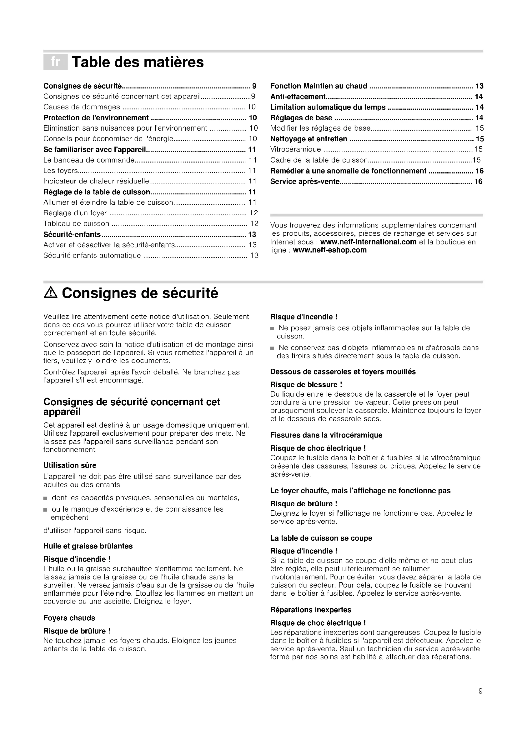- Stellen Sie keine heißen Töpfe an oder auf das Bedienfeld A 0810 240 260 D 01801 22 33 88 3,9 ct / min aus dem Festnetz (Mobil ggf. abweichend) CH 0848 840 0409 Þ Table des matières Consignes de sécurité............................................................... 9 Consignes de sécurité concernant cet appareil...........................9 Causes de dommages ...................................................................10 Protection de l'environnement ............................................... 10 Élimination sans nuisances pour l'environnement .................... 10 Conseils pour économiser de l'énergie....................................... 10 Se familiariser avec l'appareil................................................. 11 Le bandeau de commande............................................................ 11 Les foyers.......................................................................................... 11 Indicateur de chaleur résiduelle.................................................... 11 Réglage de la table de cuisson............................................... 11 Allumer et éteindre la table de cuisson....................................... 11 Réglage d'un foyer .......................................................................... 12 Tableau de cuisson ......................................................................... 12 Sécuritéenfants....................................................................... 13 Activer et désactiver la sécuritéenfants...................................... 13 Sécuritéenfants automatique ........................................................ 13 Fonction Maintien au chaud ................................................... 13 Anti-effacement........................................................................ 14 Limitation automatique du temps .......................................... 14 Réglages de base .................................................................... 14 Modifier les réglages de base....................................................... 15 Nettoyage et entretien ............................................................. 15 Vitrocéramique .................................................................................15 Cadre de la table de cuisson........................................................15 Remédier à une anomalie de fonctionnement ...................... 16 Service après-vente................................................................. 16 Produktinfo Vous trouverez des informations supplementaires concernant les produits, accessoires, pièces de rechange et services sur Internet sous : www.neff-international.com et la boutique en ligne : www.neff-eshop.com m Consignes de sécurité Veuillez lire attentivement cette notice d'utilisation. Seulement dans ce cas vous pourrez utiliser votre table de cuisson correctement et en toute sécurité. Conservez avec soin la notice d'utilisation et de montage ainsi que le passeport de l'appareil. Si vous remettez l'appareil à un tiers, veuillez-y joindre les documents. Contrôlez l'appareil après l'avoir déballé. Ne branchez pas l'appareil s'il est endommagé. Consignes de sécurité concernant cet appareil Cet appareil est destiné à un usage domestique uniquement. Utilisez l'appareil exclusivement pour préparer des mets. Ne laissez pas l'appareil sans surveillance pendant son fonctionnement. Utilisation sûre L'appareil ne doit pas être utilisé sans surveillance par des adultes ou des enfants ■ dont les capacités physiques, sensorielles ou mentales, ■ ou le manque d'expérience et de connaissance les empêchent d'utiliser l'appareil sans risque. Huile et graisse brûlantes Risque d'incendie ! L'huile ou la graisse surchauffée s'enflamme facilement. Ne laissez jamais de la graisse ou de l'huile chaude sans la surveiller. Ne versez jamais d'eau sur de la graisse ou de l'huile enflammée pour l'éteindre. Etouffez les flammes en mettant un couvercle ou une assiette. Eteignez le foyer. Foyers chauds Risque de brûlure ! Ne touchez jamais les foyers chauds. Eloignez les jeunes enfants de la table de cuisson. Risque d'incendie ! ■ Ne posez jamais des objets inflammables sur la table de cuisson. ■ Ne conservez pas d'objets inflammables ni d'aérosols dans des tiroirs situés directement sous la table de cuisson. Dessous de casseroles et foyers mouillés Risque de blessure ! Du liquide entre le dessous de la casserole et le foyer peut conduire à une pression de vapeur. Cette pression peut brusquement soulever la casserole. Maintenez toujours le foyer et le dessous de casserole secs. Fissures dans la vitrocéramique Risque de choc électrique ! Coupez le fusible dans le boîtier à fusibles si la vitrocéramique présente des cassures, fissures ou criques. Appelez le service aprèsvente. Le foyer chauffe, mais l'affichage ne fonctionne pas Risque de brûlure ! Eteignez le foyer si l'affichage ne fonctionne pas. Appelez le service aprèsvente. La table de cuisson se coupe Risque d'incendie ! Si la table de cuisson se coupe d'elle-même et ne peut plus être réglée, elle peut ultérieurement se rallumer involontairement. Pour ce éviter, vous devez séparer la table de cuisson du secteur. Pour cela, coupez le fusible se trouvant dans le boîtier à fusibles. Appelez le service aprèsvente. Réparations inexpertes Risque de choc électrique ! Les réparations inexpertes sont dangereuses. Coupez le fusible dans le boîtier à fusibles si l'appareil est défectueux. Appelez le service aprèsvente. Seul un technicien du service après-vente formé par nos soins est habilité à effectuer des réparations.10 Causes de dommages Attention ! ■ Les dessous rugueux des casseroles et des poêles rayent la vitrocéramique. ■ Evitez de faire chauffer à vide les casseroles. Des dommages peuvent survenir. ■ Ne déposez jamais des poêles ou des casseroles chaudes sur le bandeau de commande, la zone d