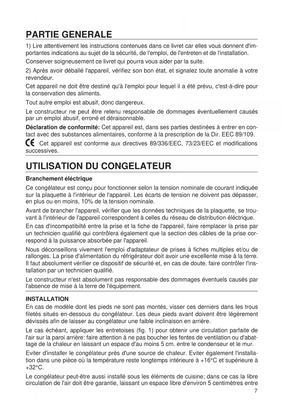 Branchement éléctrique Ce congélateur est conçu pour fonctionner selon la tension nominale de courant indiquée sur la plaquette à l'intérieur de l'appareil. Les écarts de tension ne doivent pas dépasser, en plus ou en moins, 10% de la tension nominale. Avant de brancher l'appareil, vérifier que les données techniques de la plaquette, se trou- vant à l'intérieur de l'appareil correspondent à celles du réseau de distribution éléctrique. En cas d'incompatibilté entre la prise et la fiche de l'appareil, faire remplacer la prise par un technicien qualifié qui contrôlera également que la section des câbles de la prise cor- respond à la puissance absorbée par l'appareil. Nous déconseillons vivement l'emploi d'adaptateur de prises à fiches multiples et/ou de rallonges. La prise d'alimentation du réfrigérateur doit avoir une excellente mise à la terre. Il faut absolument vérifier ce dispositif de sécurité et, en cas de doute, faire contrôler l'ins- tallation par un technicien qualifié. Le constructeur n'est absolument pas responsable des dommages éventuels causés par l'absence de mise à la terre de l'équipement. INSTALLATION En cas de modèle dont les pieds ne sont pas montés, visser ces derniers dans les trous filetés situés en-dessous du congélateur. Les deux pieds avant doivent être légèrement dévissés afin de laisser au congélateur une faible inclinaison en arrière. Le cas échéant, appliquer les entretoises (fig. 1) pour obtenir une circulation parfaite de l'air sur la paroi arrière: faire attention à ne pas boucher les fentes de ventilation ou d'abat- tage de la chaleur en laissant un espace d'au moins 5 cm. entre le condenseur et le mur. Eviter d'installer le congélateur près d'une source de chaleur. Eviter également l'installa- tion dans une pièce où la température reste longtemps intérieure à +16°C et supérieure à +32°C. Le congélateur peut-être aussi installé sous les éléments de cuisine; dans ce cas la libre circulation de l'air doit être garantie, laissant un espace libre d'environ 5 centimètres entre 7le meuble et l'appareil ou dans la partie postérieure du meuble. Une mauvaise installation peut causer des dommages aux personnes, aux animaux et aux choses et le constructeur ne peut en être retenu responsable.