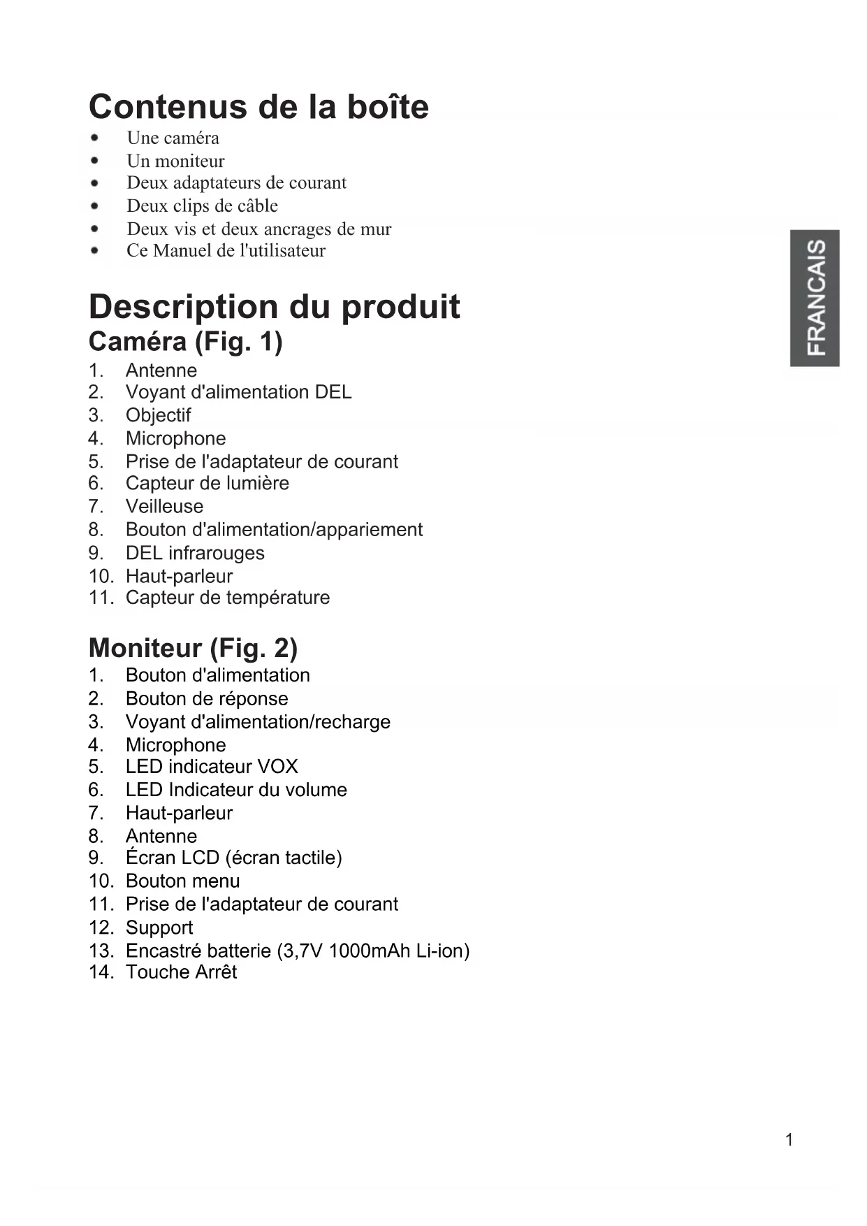 | Hors portée Connexion perdue | Bips continus pendant une minute | Déplacez le monitour plus pres de laamera. Vérifiez l'alimentation de laamera. |