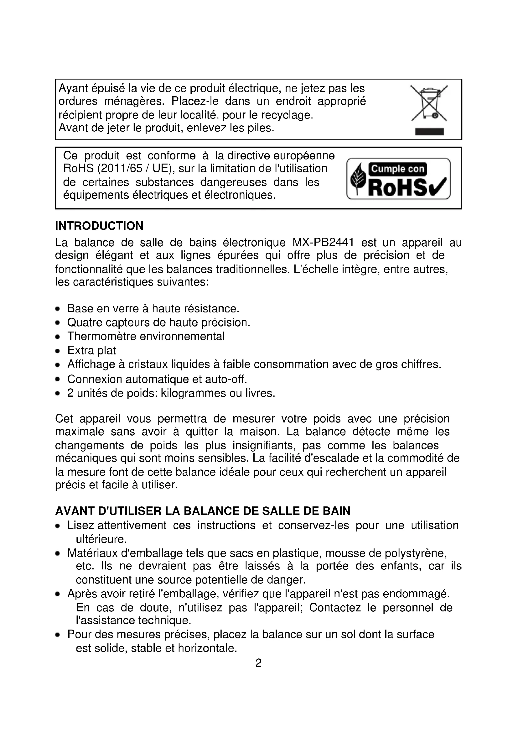 INTRODUCTION La balance de salle de bains électronique MX-PB2441 est un appareil au design élégant et aux lignes épurées qui offre plus de précision et de fonctionnalité que les balances traditionnelles. L'échelle intègre, entre autres, les caractéristiques suivantes: Base en verre à haute résistance. Quatre capteurs de haute précision. Thermomètre environnemental Extra plat Affichage à cristaux liquides à faible consommation avec de gros chiffres. Connexion automatique et auto-off. 2 unités de poids: kilogrammes ou livres. Cet appareil vous permettra de mesurer votre poids avec une précision maximale sans avoir à quitter la maison. La balance détecte même les changements de poids les plus insignifiants, pas comme les balances mécaniques qui sont moins sensibles. La facilité d'escalade et la commodité de la mesure font de cette balance idéale pour ceux qui recherchent un appareil précis et facile à utiliser. AVANT D'UTILISER LA BALANCE DE SALLE DE BAIN Lisez attentivement ces instructions et conservez-les pour une utilisation ultérieure. Matériaux d'emballage tels que sacs en plastique, mousse de polystyrène, etc. Ils ne devraient pas être laissés à la portée des enfants, car ils constituent une source potentielle de danger. Après avoir retiré l'emballage, vérifiez que l'appareil n'est pas endommagé. En cas de doute, n'utilisez pas l'appareil; Contactez le personnel de l'assistance technique. Pour des mesures précises, placez la balance sur un sol dont la surface est solide, stable et horizontale.