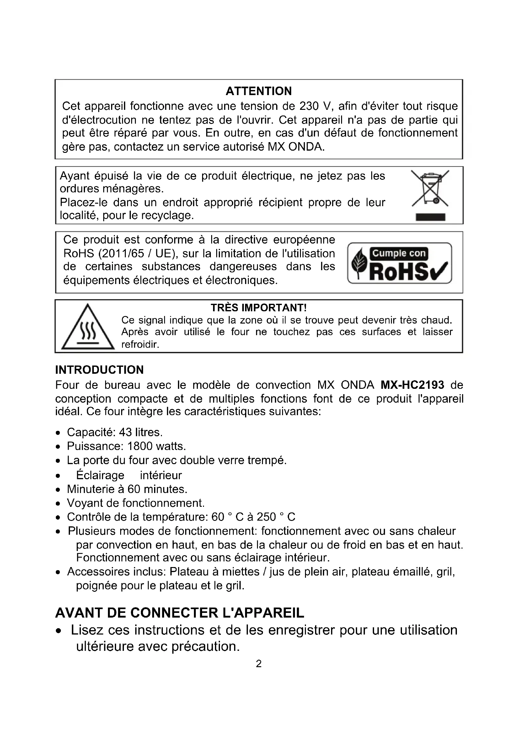 Ce produit est conforme à la directive européenne RoHS (2011/65 / UE), sur la limitation de l'utilisation de certaines substances dangereuses dans les équipements électriques et électroniques. TRÈS IMPORTANT! Ce signal indique que la zone où il se trouve peut devenir très chaud. Après avoir utilisé le four ne touchez pas ces surfaces et laisser refroidir. INTRODUCTION Four de bureau avec le modèle de convection MX ONDA MX-HC2193 de conception compacte et de multiples fonctions font de ce produit l'appareil idéal. Ce four intègre les caractéristiques suivantes: