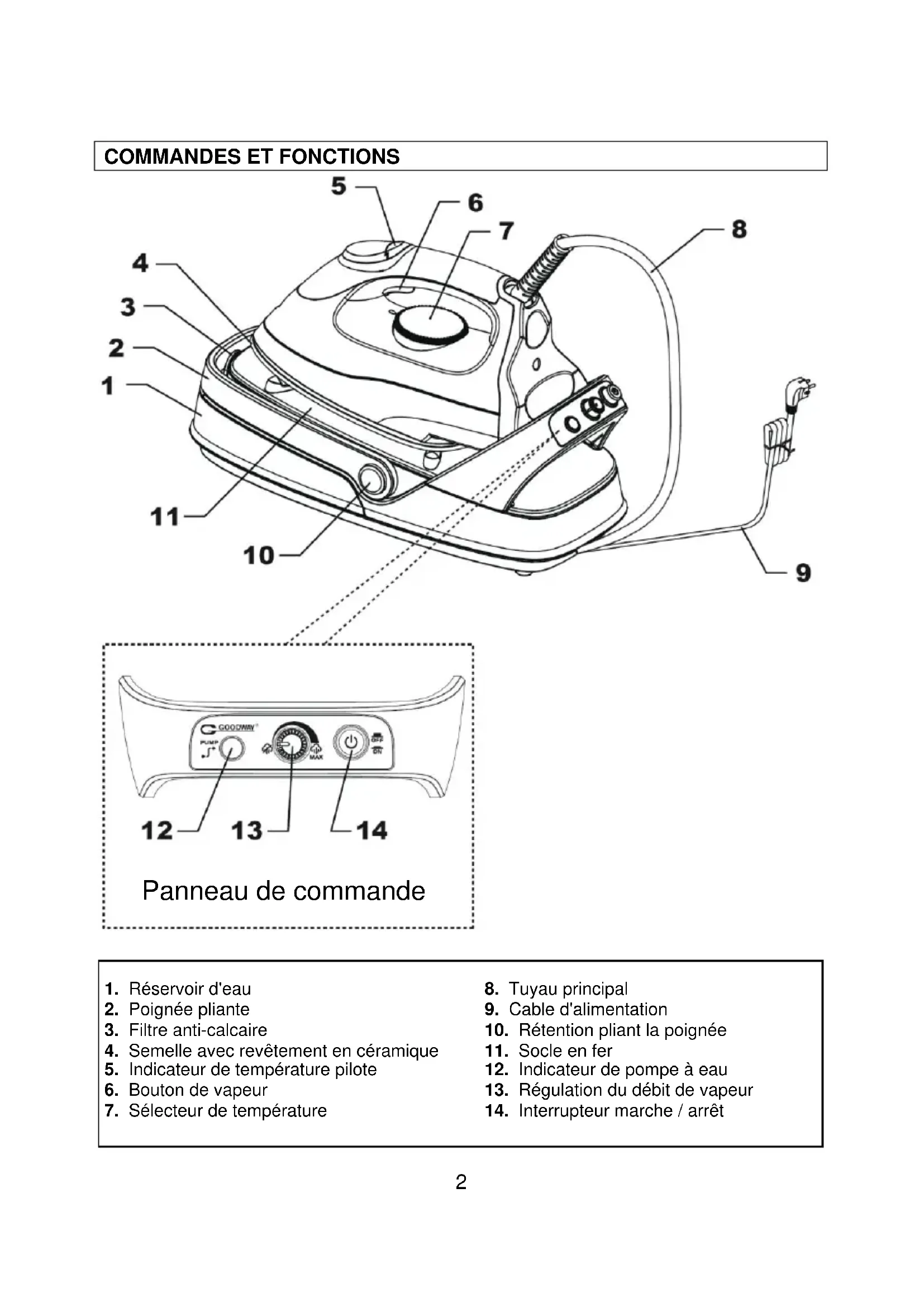 L’indicateur de fonctionnement de la pompe à eau, du régulateur de débit de vapeur et de l’interrupteur général de marche / arrêt se trouvent sur le panneau de commande. Indicateur de fonctionnement de la pompe à eau En appuyant sur le bouton de vapeur 6, cet indicateur s’allumera et la pompe à eau commencera à fonctionner, la vapeur sortant par les trous dans la semelle du fer.