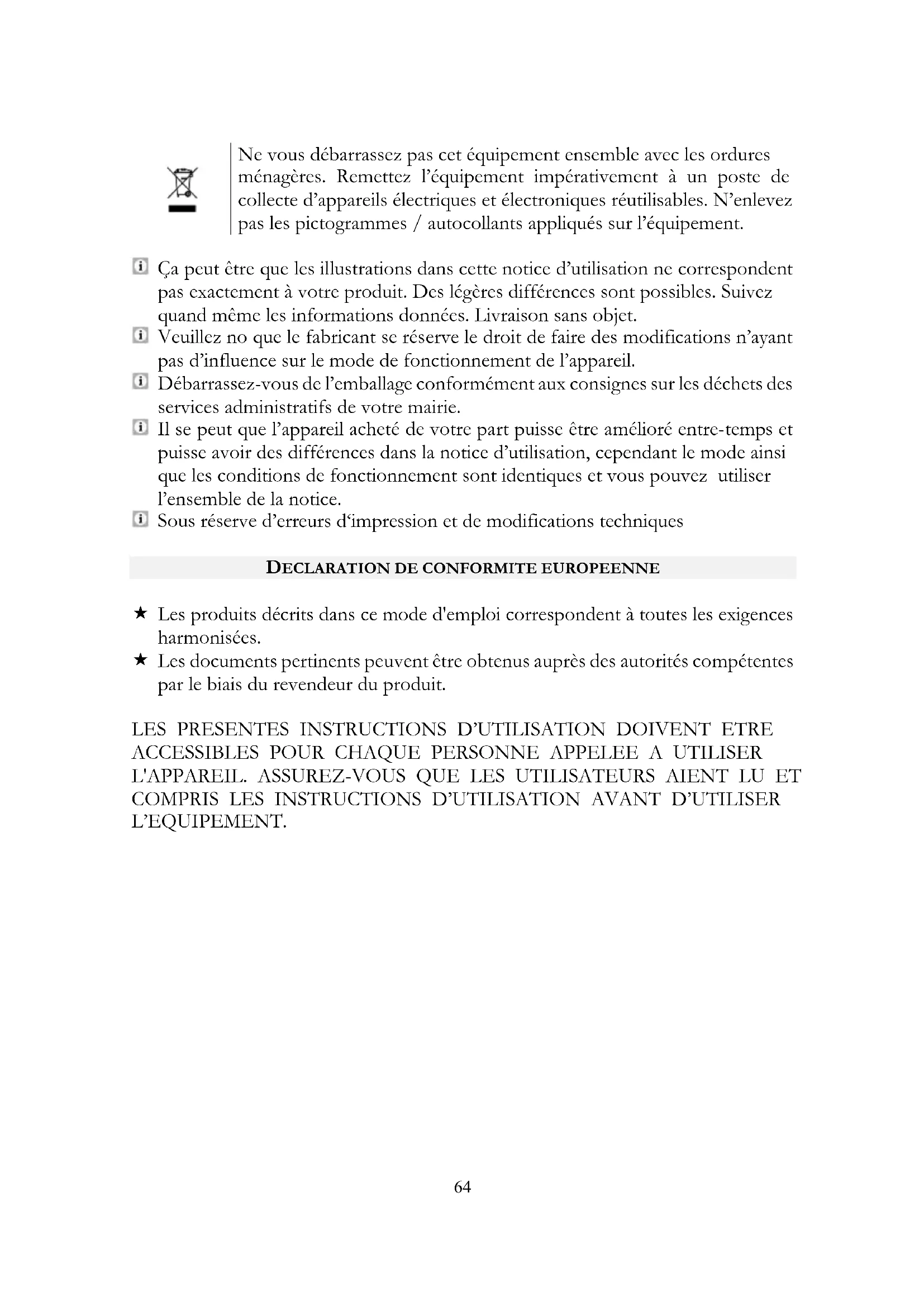 Ne vous débarrasssez pas cet équipement ensemble avec les ordures ménagères. Rémcttz l'équipment impératifement à un poste de collecte d'appareils électriques et électroniques réutilisables. N'envez pas les pictogrammes / autocollants appliqués sur l'équipment.