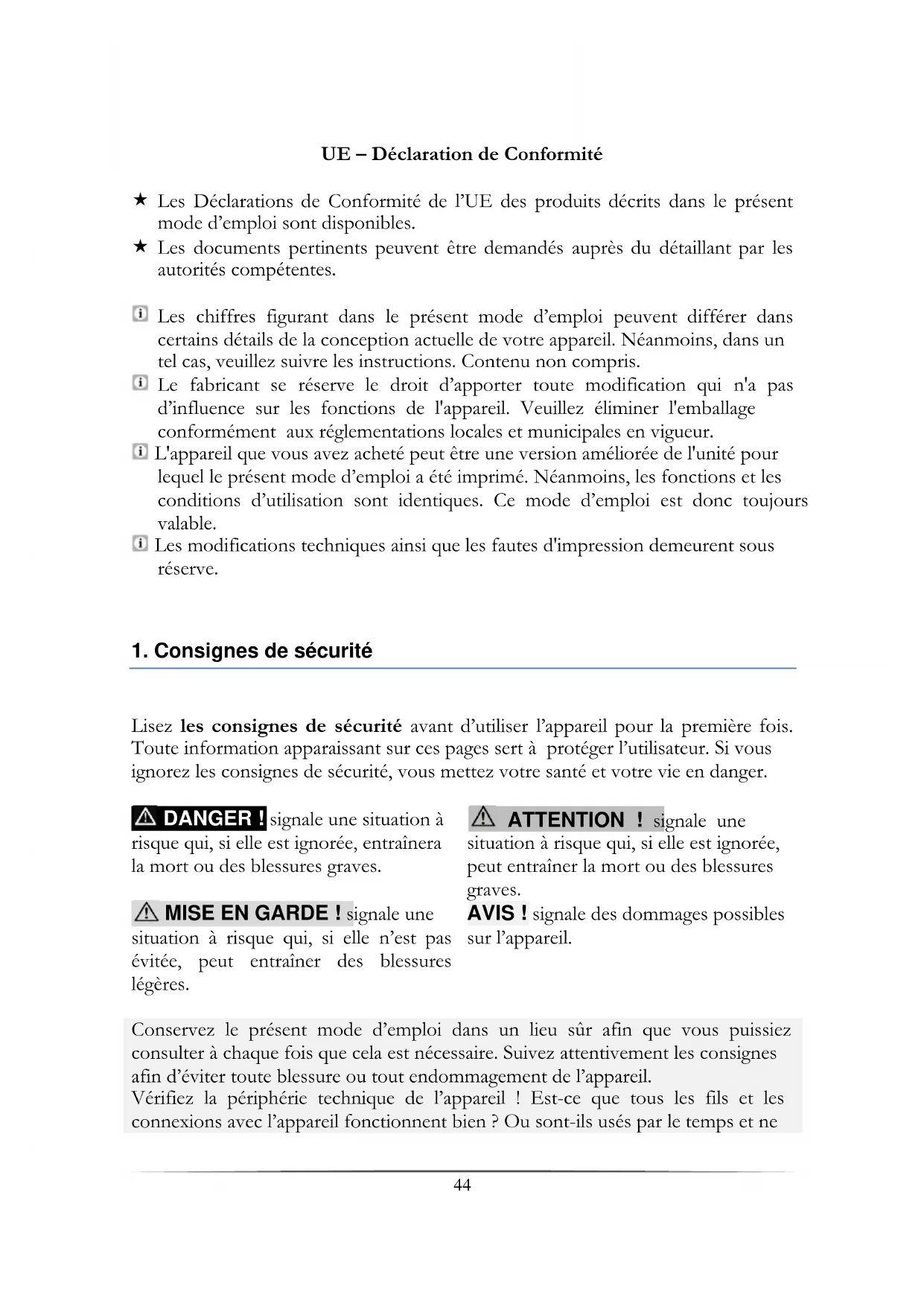 6. Données techniques .................................................................................................... 62 7. Gestion de déchets ...................................................................................................... 6344 UE – Déclaration de Conformité Les Déclarations de Conformité de l’UE des produits décrits dans le présent mode d’emploi sont disponibles. Les documents pertinents peuvent être demandés auprès du détaillant par les autorités compétentes. Les chiffres figurant dans le présent mode d’emploi peuvent différer dans certains détails de la conception actuelle de votre appareil. Néanmoins, dans un tel cas, veuillez suivre les instructions. Contenu non compris. Le fabricant se réserve le droit d’apporter toute modification qui n'a pas d’influence sur les fonctions de l'appareil. Veuillez éliminer l'emballage conformément aux réglementations locales et municipales en vigueur. L'appareil que vous avez acheté peut être une version améliorée de l'unité pour lequel le présent mode d’emploi a été imprimé. Néanmoins, les fonctions et les conditions d’utilisation sont identiques. Ce mode d’emploi est donc toujours valable. Les modifications techniques ainsi que les fautes d'impression demeurent sous réserve.