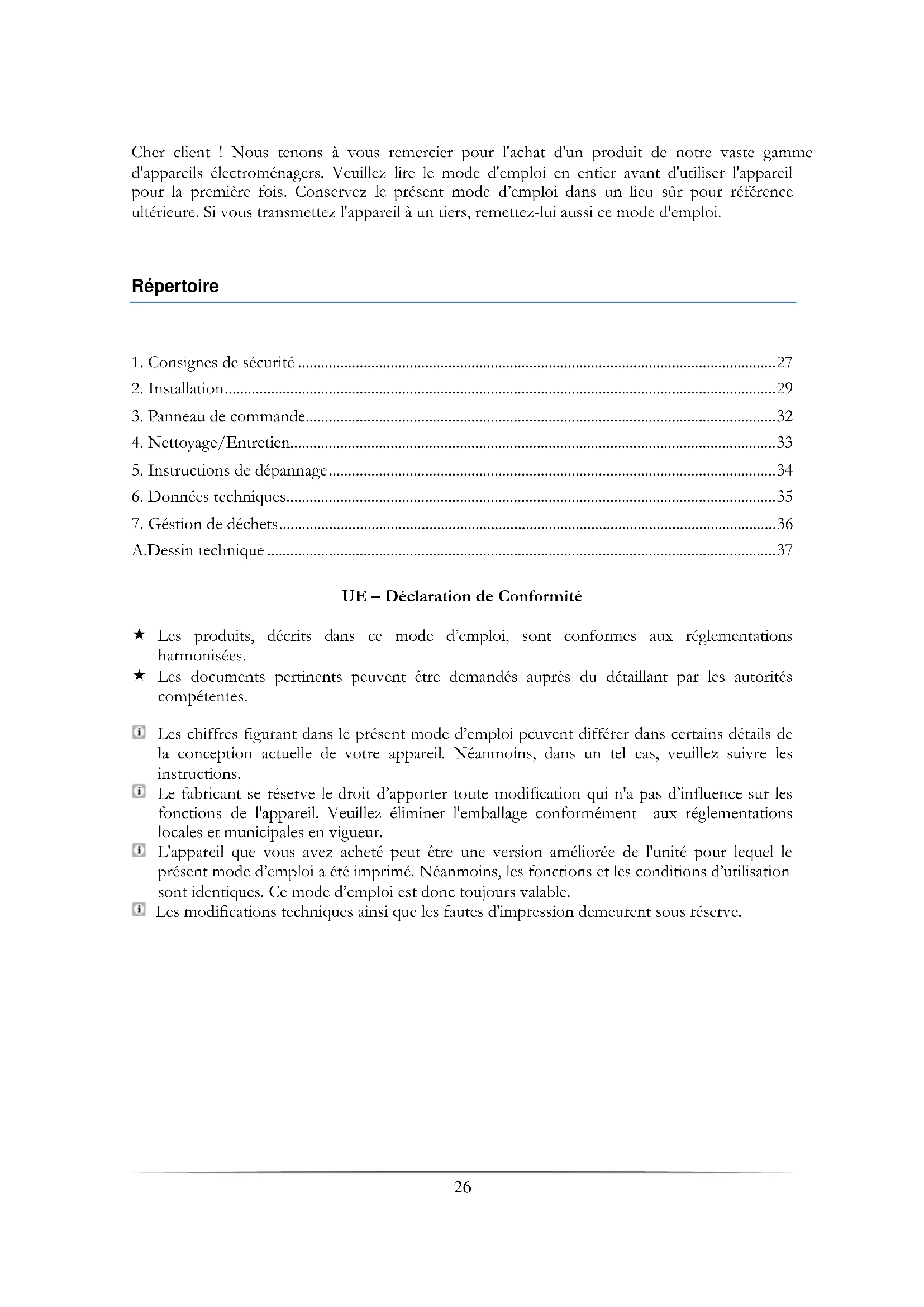 Cher client ! Nous tenons à vous remercier pour l'achat d'un produit de notre vaste gamme d'appareils électroménagers. Veuillez lire le mode d'emploi en entier avant d'utiliser l'apparcil pour la première fois. Conservez le présent mode d'emploi dans un lieu sûr pour référence ultérieure. Si vous transmettez l'appareil à un tiers, remettez-lui aussi ce mode d'emploi.