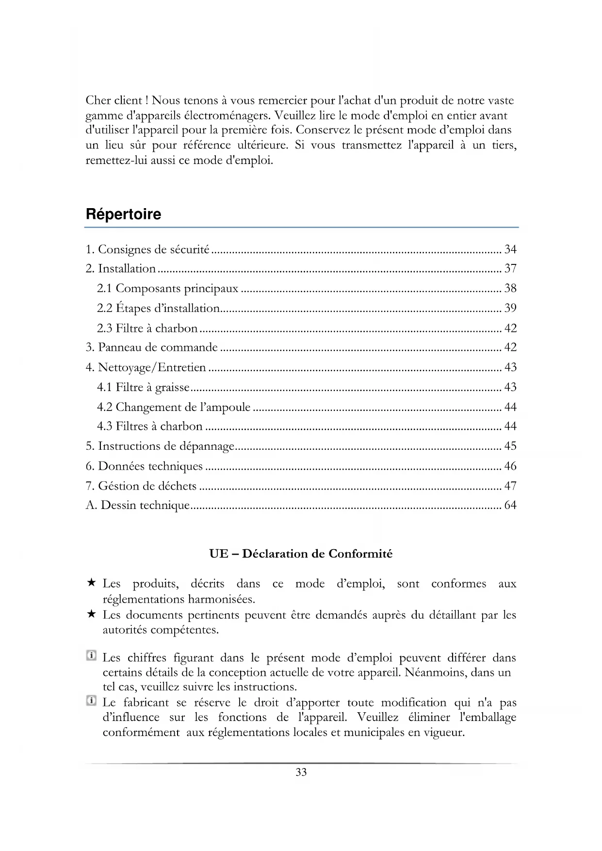 with not being limited to fires or explosions. The guarantee claims neither extend the guarantee period nor initiate a new guarantee period. The geographical scope of the guarantee is limited with respect to appliances, which are purchased and used in Germany, Austria, Belgium, Luxembourg and the Netherlands. August 201433 Cher client ! Nous tenons à vous remercier pour l'achat d'un produit de notre vaste gamme d'appareils électroménagers. Veuillez lire le mode d'emploi en entier avant d'utiliser l'appareil pour la première fois. Conservez le présent mode d’emploi dans un lieu sûr pour référence ultérieure. Si vous transmettez l'appareil à un tiers, remettez-lui aussi ce mode d'emploi. Répertoire 1. Consignes de sécurité .................................................................................................. 34 2. Installation .................................................................................................................... 37