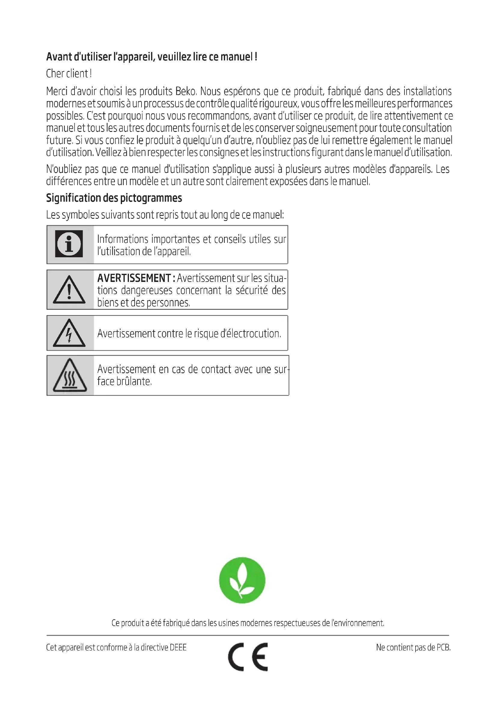 Lampide väljavahetamiseks pöör-duge volitatud hooldustehniku poole.Ce produit a été fabriqué dans les usines modernes respectueuses de l'environnement. Cet appareil est conforme à la directive DEEE Ne contient pas de PCB. Avant d'utiliser l'appareil, veuillez lire ce manuel ! Cher client ! Merci d’avoir choisi les produits Beko. Nous espérons que ce produit, fabriqué dans des installations modernes et soumis à un processus de contrôle qualité rigoureux, vous offre les meilleures performances possibles. C’est pourquoi nous vous recommandons, avant d’utiliser ce produit, de lire attentivement ce manuel et tous les autres documents fournis et de les conserver soigneusement pour toute consultation future. Si vous confiez le produit à quelqu’un d’autre, n’oubliez pas de lui remettre également le manuel d’utilisation. Veillez à bien respecter les consignes et les instructions figurant dans le manuel d’utilisation. N'oubliez pas que ce manuel d'utilisation s'applique aussi à plusieurs autres modèles d'appareils. Les différences entre un modèle et un autre sont clairement exposées dans le manuel. Signification des pictogrammes Les symboles suivants sont repris tout au long de ce manuel: