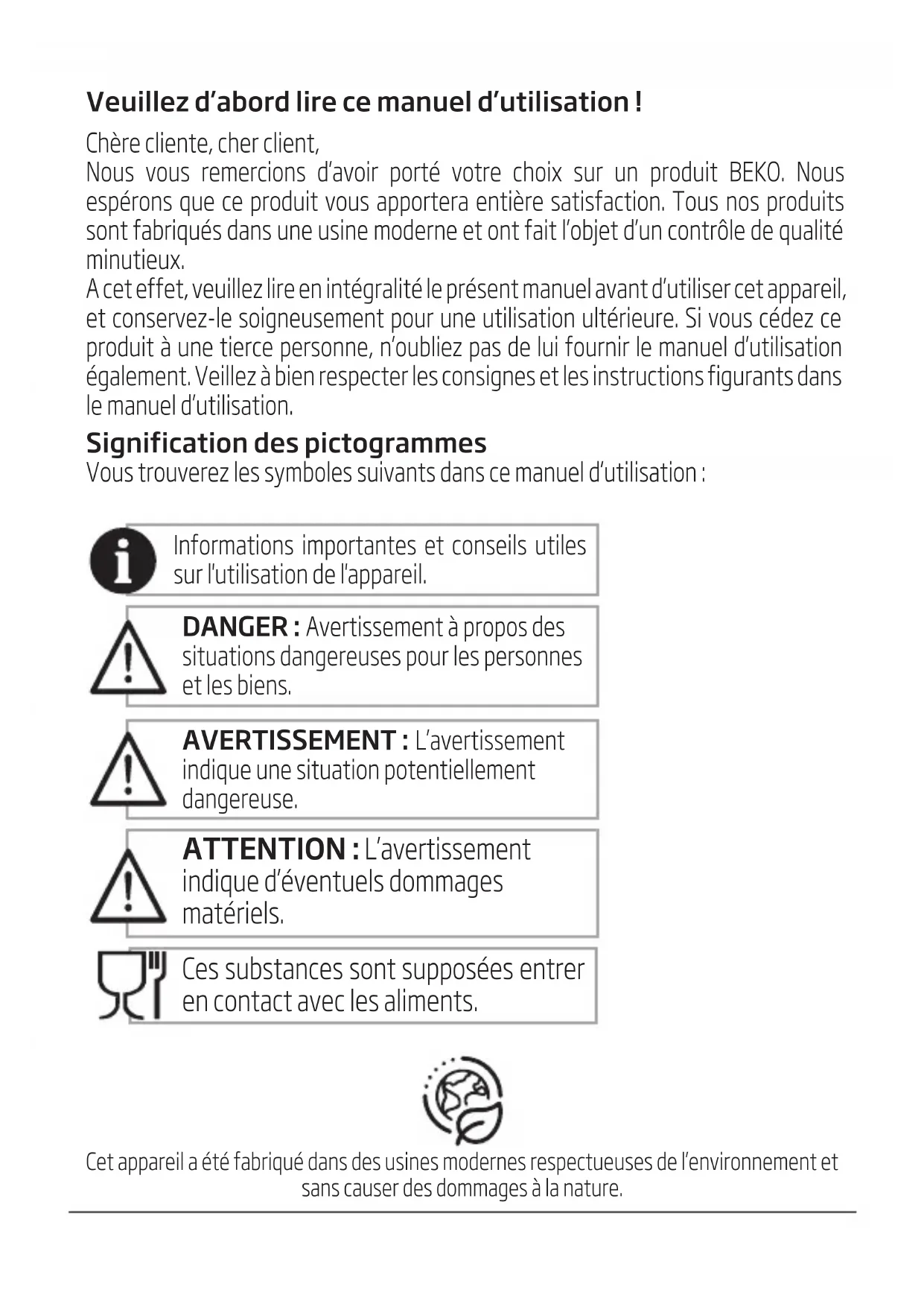 Diese Garantiezusage ist nur gültig innerhalb der Bundesrepublik Deutschland Garantiebedingungen - Beko – Version Februar 2021Veuillez d’abord lire ce manuel d’utilisation ! Chère cliente, cher client, Nous vous remercions d’avoir porté votre choix sur un produit BEKO. Nous espérons que ce produit vous apportera entière satisfaction. Tous nos produits sont fabriqués dans une usine moderne et ont fait l’objet d’un contrôle de qualité minutieux. A cet effet, veuillez lire en intégralité le présent manuel avant d’utiliser cet appareil, et conservez-le soigneusement pour une utilisation ultérieure. Si vous cédez ce produit à une tierce personne, n’oubliez pas de lui fournir le manuel d’utilisation également. Veillez à bien respecter les consignes et les instructions figurants dans le manuel d’utilisation. Signification des pictogrammes Vous trouverez les symboles suivants dans ce manuel d’utilisation : Informatons mportantes et consels utles sur l'utlsaton de l'apparel.