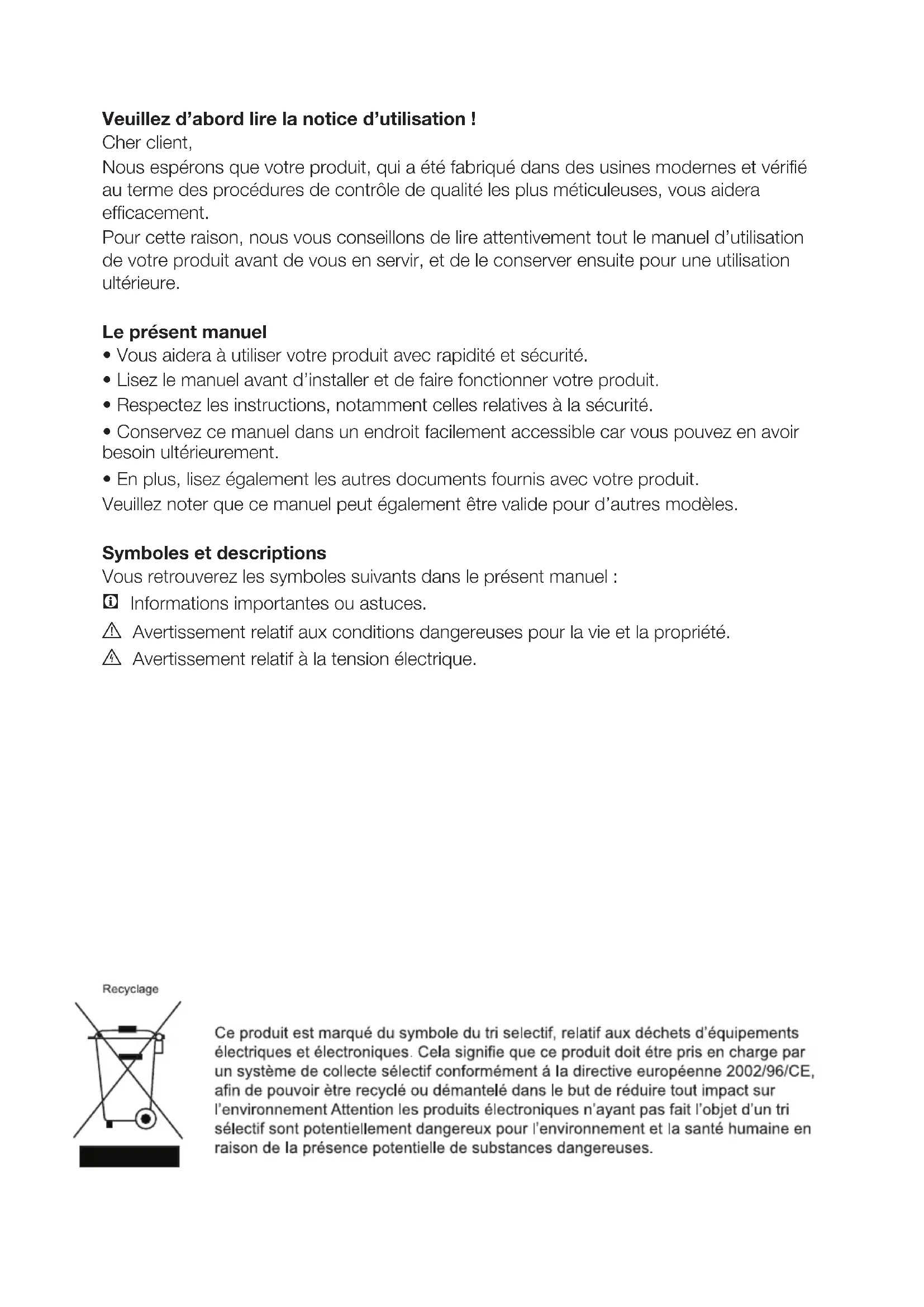 - Lisez le manuel avant d’installer et de faire fonctionner votre produit.