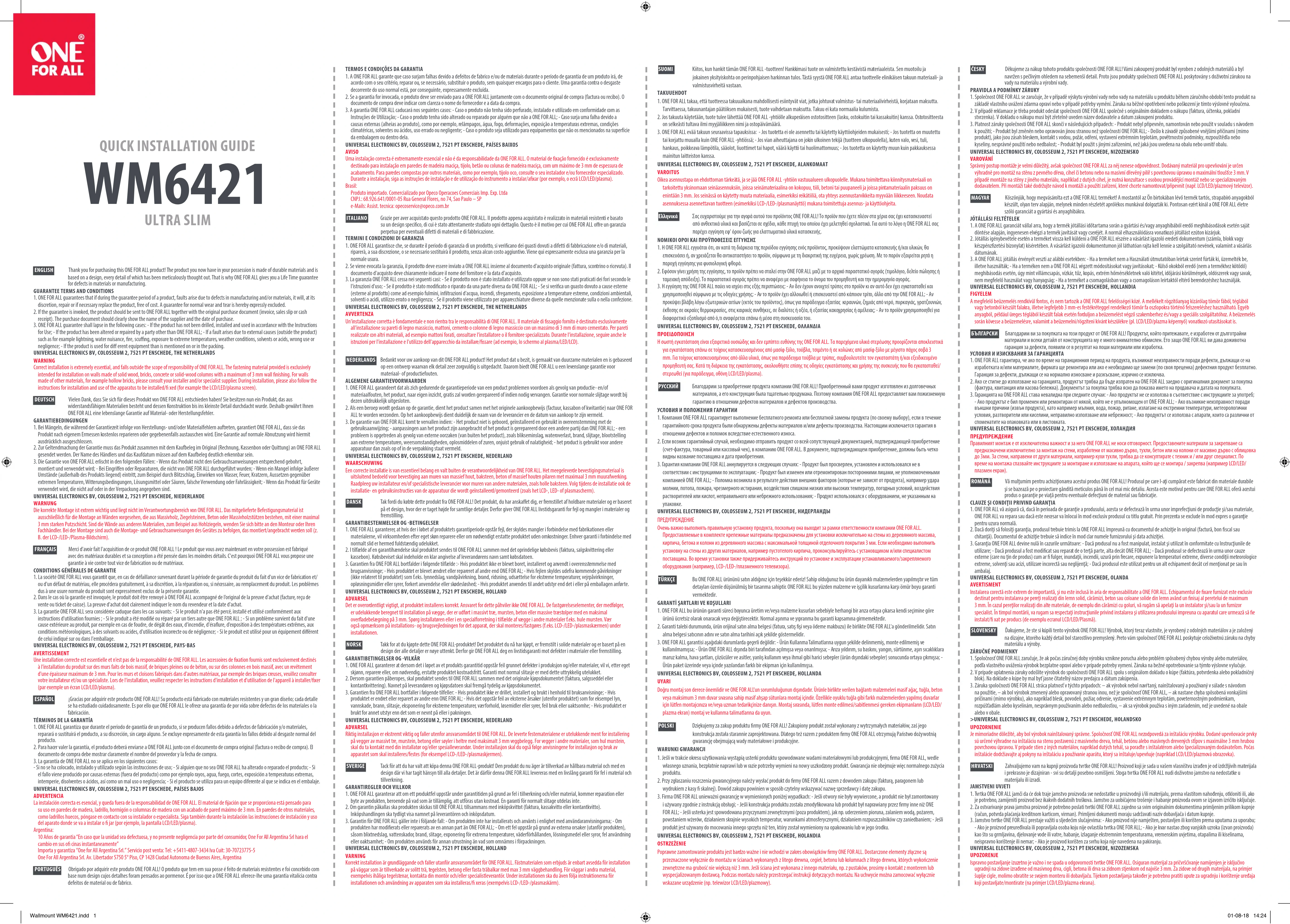 1. La société ONE FOR ALL vous garantit que, en cas de défaillance survenant durant la période de garantie du produit du fait d'un vice de fabrication et/ ou d'un défaut de matériau, elle procédera gratuitement, à sa discrétion, à la réparation ou, si nécessaire, au remplacement du produit. Les problèmes dus à une usure normale du produit sont expressément exclus de la présente garantie. 2. Dans le cas où la garantie est invoquée, le produit doit être renvoyé à ONE FOR ALL accompagné de l'original de la preuve d'achat (facture, reçu de vente ou ticket de caisse). La preuve d'achat doit clairement indiquer le nom du revendeur et la date d'achat. 3. La garantie ONE FOR ALL sera considérée caduque dans les cas suivants: - Si le produit n'a pas été percé, installé et utilisé conformément aux instructions d'utilisation fournies ; - Si le produit a été modi é ou réparé par un tiers autre que ONE FOR ALL ; - Si un problème survient du fait d'une cause extérieure au produit, par exemple en cas de foudre, de dégât des eaux, d'incendie, d'éra ure, d'exposition à des températures extrêmes, aux conditions météorologiques, à des solvants ou acides, d'utilisation incorrecte ou de négligence; - Si le produit est utilisé pour un équipement di érent de celui indiqué sur ou dans l'emballage. UNIVERSAL ELECTRONICS BV, COLOSSEUM 2, 7521 PT ENSCHEDE, PAYS-BAS AVERTISSEMENT Une installation correcte est essentielle et n'est pas de la responsabilité de ONE FOR ALL. Les accessoires de xation fournis sont exclusivement destinés à l'installation du produit sur des murs faits de bois massif, de briques pleines ou de béton, ou sur des colonnes en bois massif, avec un revêtement d'une épaisseur maximum de 3 mm. Pour les murs et cloisons fabriqués dans d'autres matériaux, par exemple des briques creuses, veuillez consulter votre installateur et/ou un spécialiste. Lors de l'installation, veuillez respecter les instructions d'installation et d'utilisation de l'appareil à installer/ xer (par exemple un écran LCD/LED/plasma). ESPAÑOL ¡Gracias por adquirir este producto ONE FOR ALL! Su producto está fabricado con materiales resistentes y un gran diseño; cada detalle se ha estudiado cuidadosamente. Es por ello que ONE FOR ALL le ofrece una garantía de por vida sobre defectos de los materiales o la fabricación.