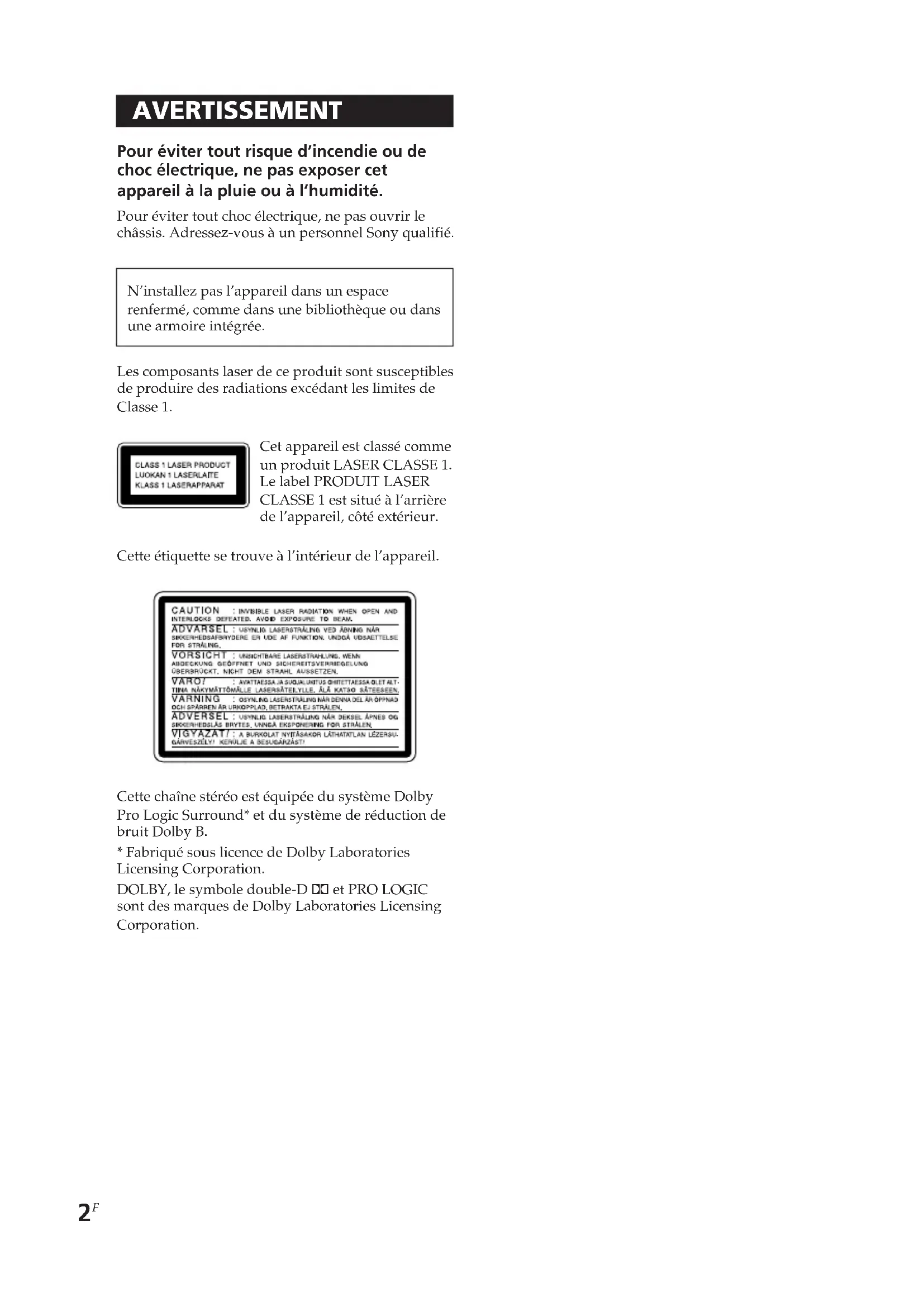 AVERTISSEMENT Pour éviter tout risque d’incendie ou de choc électrique, ne pas exposer cet appareil à la pluie ou à l’humidité. Pour éviter tout choc électrique, ne pas ouvrir le châssis. Adressez-vous à un personnel Sony qualifié. N’installez pas l’appareil dans un espace renfermé, comme dans une bibliothèque ou dans une armoire intégrée. Les composants laser de ce produit sont susceptibles de produire des radiations excédant les limites de Classe 1. Cette étiquette se trouve à l’intérieur de l’appareil. Cet appareil est classé comme un produit LASER CLASSE 1. Le label PRODUIT LASER CLASSE 1 est situé à l’arrière de l’appareil, côté extérieur. Cette chaîne stéréo est équipée du système Dolby Pro Logic Surround* et du système de réduction de bruit Dolby B.