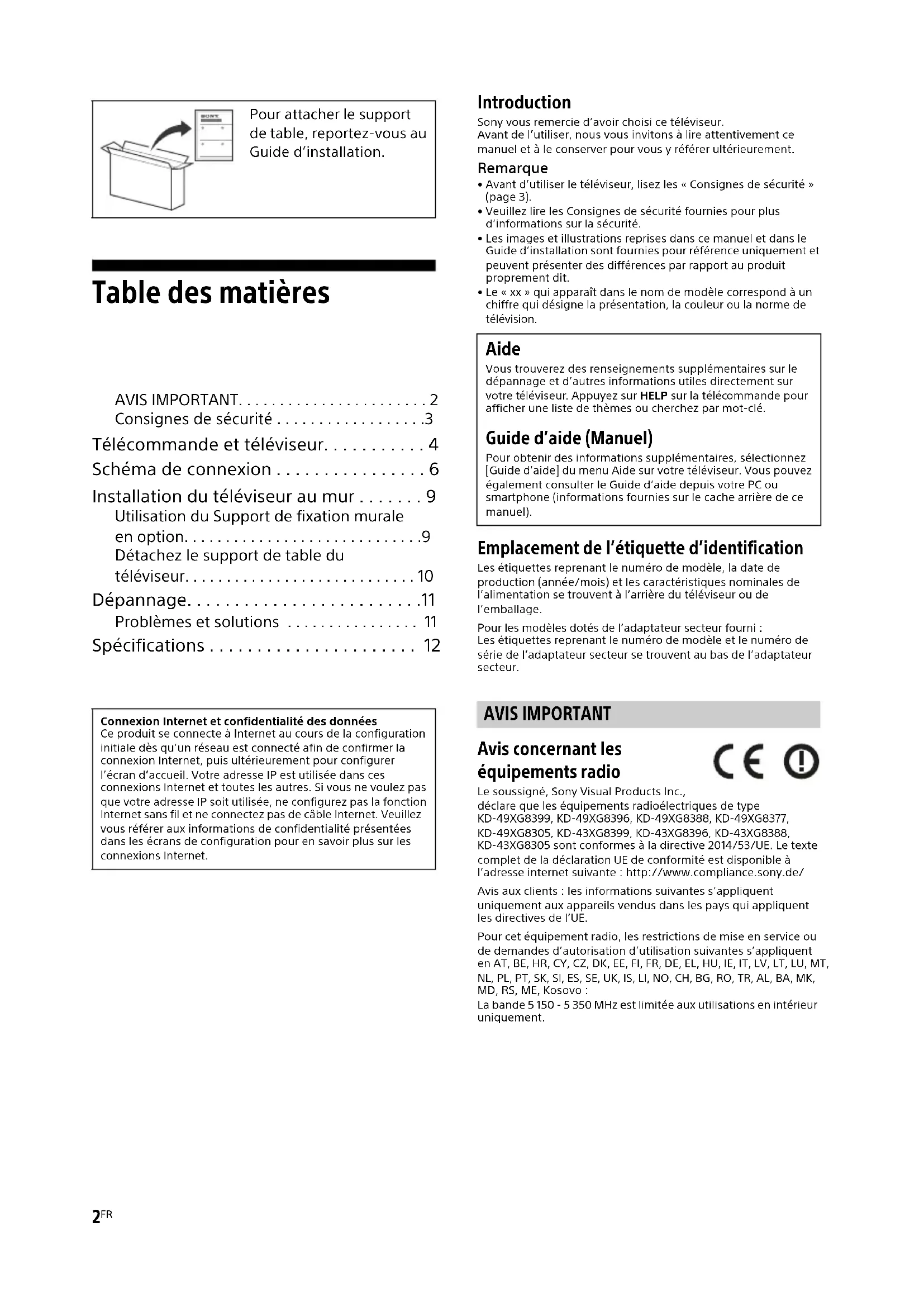 - Avant d’utiliser le téléviseur, lisez les « Consignes de sécurité » (page 3).• Veuillez lire les Consignes de sécurité fournies pour plus d’informations sur la sécurité.• Les images et illustrations reprises dans ce manuel et dans le Guide d’installation sont fournies pour référence uniquement et peuvent présenter des différences par rapport au produit proprement dit.• Le « xx » qui apparaît dans le nom de modèle correspond à un chiffre qui désigne la présentation, la couleur ou la norme de télévision. Emplacement de l’étiquette d’identification Les étiquettes reprenant le numéro de modèle, la date de production (année/mois) et les caractéristiques nominales de l’alimentation se trouvent à l’arrière du téléviseur ou de l’emballage.Pour les modèles dotés de l’adaptateur secteur fourni :Les étiquettes reprenant le numéro de modèle et le numéro de série de l’adaptateur secteur se trouvent au bas de l’adaptateur secteur. AVIS IMPORTANT Avis concernant les équipements radio Le soussigné, Sony Visual Products Inc., déclare que les équipements radioélectriques de type KD-49XG8399, KD-49XG8396, KD-49XG8388, KD-49XG8377, KD-49XG8305, KD-43XG8399, KD-43XG8396, KD-43XG8388, KD-43XG8305 sont conformes à la directive 2014/53/UE. Le texte complet de la déclaration UE de conformité est disponible à l’adresse internet suivante : http://www.compliance.sony.de/Avis aux clients : les informations suivantes s’appliquent uniquement aux appareils vendus dans les pays qui appliquent les directives de l’UE.Pour cet équipement radio, les restrictions de mise en service ou de demandes d’autorisation d’utilisation suivantes s’appliquent en AT, BE, HR, CY, CZ, DK, EE, FI, FR, DE, EL, HU, IE, IT, LV, LT, LU, MT, NL, PL, PT, SK, SI, ES, SE, UK, IS, LI, NO, CH, BG, RO, TR, AL, BA, MK, MD, RS, ME, Kosovo :La bande 5 150 - 5 350 MHz est limitée aux utilisations en intérieur uniquement. Pour attacher le support de table, reportez-vous au Guide d’installation. Connexion Internet et confidentialité des donnéesCe produit se connecte à Internet au cours de la configuration initiale dès qu’un réseau est connecté afin de confirmer la connexion Internet, puis ultérieurement pour configurer l’écran d’accueil. Votre adresse IP est utilisée dans ces connexions Internet et toutes les autres. Si vous ne voulez pas que votre adresse IP soit utilisée, ne configurez pas la fonction Internet sans fil et ne connectez pas de câble Internet. Veuillez vous référer aux informations de confidentialité présentées dans les écrans de configuration pour en savoir plus sur les connexions Internet. Aide Vous trouverez des renseignements supplémentaires sur le dépannage et d’autres informations utiles directement sur votre téléviseur. Appuyez sur HELP sur la télécommande pour afficher une liste de thèmes ou cherchez par mot-clé. Guide d’aide (Manuel) Pour obtenir des informations supplémentaires, sélectionnez [Guide d'aide] du menu Aide sur votre téléviseur. Vous pouvez également consulter le Guide d’aide depuis votre PC ou smartphone (informations fournies sur le cache arrière de ce manuel).D:\_SONY TV\CHH2\SY19_CHH2_EU_RG_131\4748430131\4748430131_02FR\4748430131_02FR.fm master page: Right KD-49XG83xx / 43XG83xx 4-748-430-13(1)