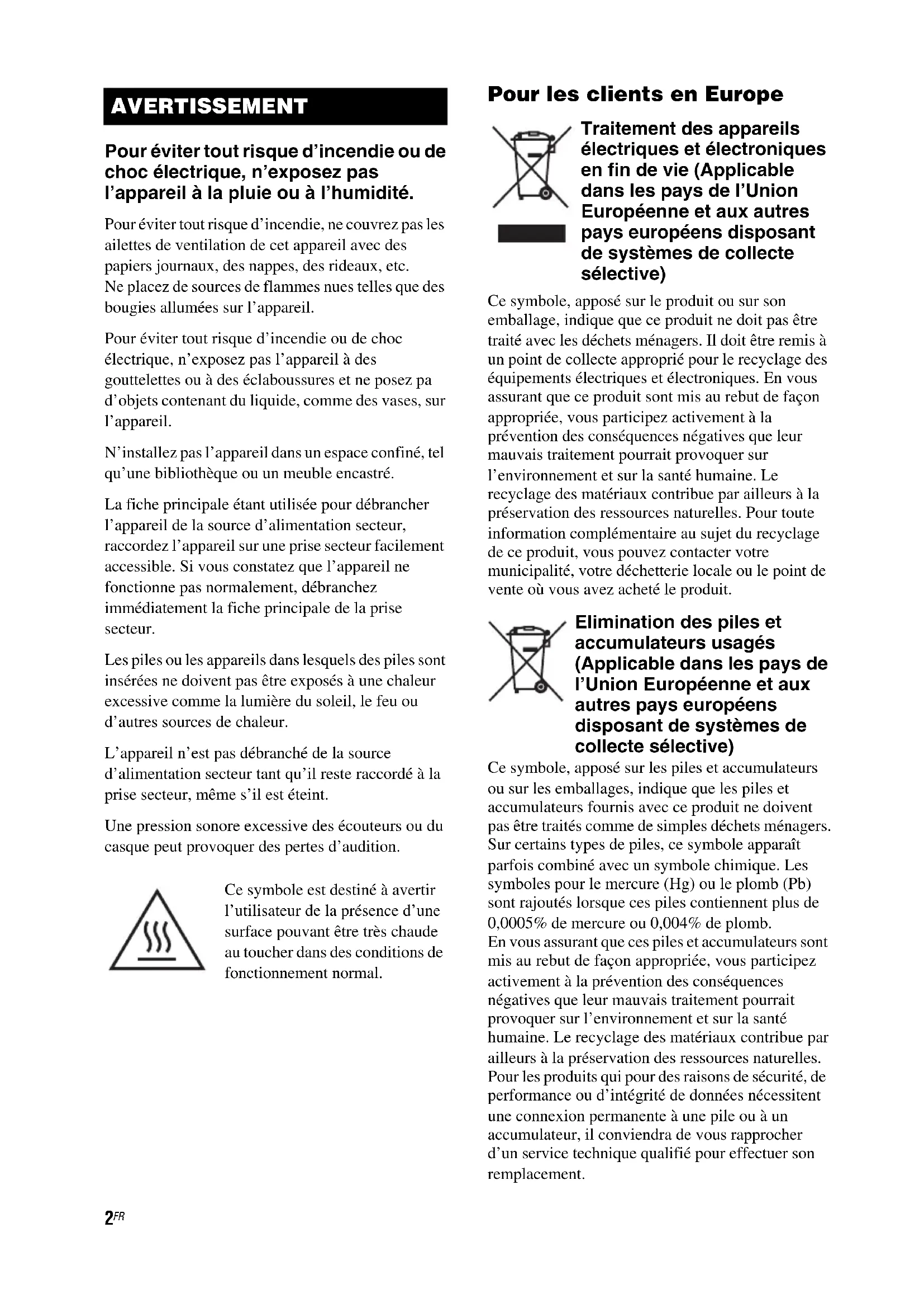 D:\NORM'S JOB\SONY HA\SO130042\STR-DH830_DH730_PMRF 03\4408151222_FR\FR02REG_STR-DH730-CEL.fm4-408-151-22(2) masterpage: Left STR-DH830/STR-DH730 4-408-151-22(2) Pour éviter tout risque d’incendie ou de choc électrique, n’exposez pas l’appareil à la pluie ou à l’humidité. Pour éviter tout risque d’incendie, ne couvrez pas les ailettes de ventilation de cet appareil avec des papiers journaux, des nappes, des rideaux, etc. Ne placez de sources de flammes nues telles que des bougies allumées sur l’appareil. Pour éviter tout risque d’incendie ou de choc électrique, n’exposez pas l’appareil à des gouttelettes ou à des éclaboussures et ne posez pa d’objets contenant du liquide, comme des vases, sur l’appareil. N’installez pas l’appareil dans un espace confiné, tel qu’une bibliothèque ou un meuble encastré. La fiche principale étant utilisée pour débrancher l’appareil de la source d’alimentation secteur, raccordez l’appareil sur une prise secteur facilement accessible. Si vous constatez que l’appareil ne fonctionne pas normalement, débranchez immédiatement la fiche principale de la prise secteur. Les piles ou les appareils dans lesquels des piles sont insérées ne doivent pas être exposés à une chaleur excessive comme la lumière du soleil, le feu ou d’autres sources de chaleur. L’appareil n’est pas débranché de la source d’alimentation secteur tant qu’il reste raccordé à la prise secteur, même s’il est éteint. Une pression sonore excessive des écouteurs ou du casque peut provoquer des pertes d’audition. Ce symbole est destiné à avertir l’utilisateur de la présence d’une surface pouvant être très chaude au toucher dans des conditions de fonctionnement normal. Pour les clients en Europe Traitement des appareils électriques et électroniques en fin de vie (Applicable dans les pays de l’Union Européenne et aux autres pays européens disposant de systèmes de collecte sélective) Ce symbole, apposé sur le produit ou sur son emballage, indique que ce produit ne doit pas être traité avec les déchets ménagers. Il doit être remis à un point de collecte approprié pour le recyclage des équipements électriques et électroniques. En vous assurant que ce produit sont mis au rebut de façon appropriée, vous participez activement à la prévention des conséquences négatives que leur mauvais traitement pourrait provoquer sur l’environnement et sur la santé humaine. Le recyclage des matériaux contribue par ailleurs à la préservation des ressources naturelles. Pour toute information complémentaire au sujet du recyclage de ce produit, vous pouvez contacter votre municipalité, votre déchetterie locale ou le point de vente où vous avez acheté le produit. Elimination des piles et accumulateurs usagés (Applicable dans les pays de l’Union Européenne et aux autres pays européens disposant de systèmes de collecte sélective) Ce symbole, apposé sur les piles et accumulateurs ou sur les emballages, indique que les piles et accumulateurs fournis avec ce produit ne doivent pas être traités comme de simples déchets ménagers. Sur certains types de piles, ce symbole apparaît parfois combiné avec un symbole chimique. Les symboles pour le mercure (Hg) ou le plomb (Pb) sont rajoutés lorsque ces piles contiennent plus de 0,0005% de mercure ou 0,004% de plomb. En vous assurant que ces piles et accumulateurs sont mis au rebut de façon appropriée, vous participez activement à la prévention des conséquences négatives que leur mauvais traitement pourrait provoquer sur l’environnement et sur la santé humaine. Le recyclage des matériaux contribue par ailleurs à la préservation des ressources naturelles. Pour les produits qui pour des raisons de sécurité, de performance ou d’intégrité de données nécessitent une connexion permanente à une pile ou à un accumulateur, il conviendra de vous rapprocher d’un service technique qualifié pour effectuer son remplacement. AVERTISSEMENT3