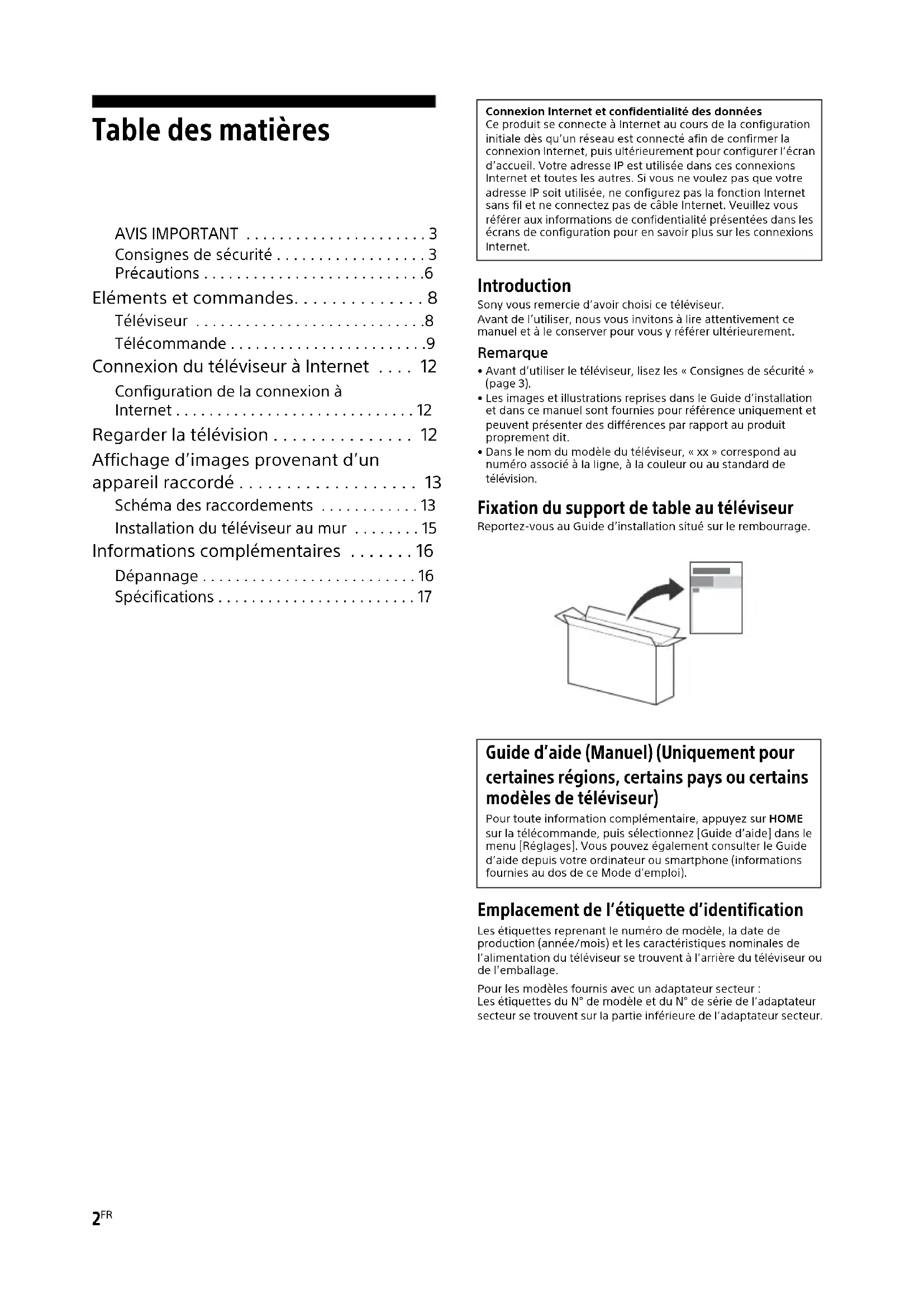 - Avant d’utiliser le téléviseur, lisez les « Consignes de sécurité » (page 3).• Les images et illustrations reprises dans le Guide d’installation et dans ce manuel sont fournies pour référence uniquement et peuvent présenter des différences par rapport au produit proprement dit.• Dans le nom du modèle du téléviseur, « xx » correspond au numéro associé à la ligne, à la couleur ou au standard de télévision. Fixation du support de table au téléviseur Reportez-vous au Guide d’installation situé sur le rembourrage. Emplacement de l’étiquette d’identification Les étiquettes reprenant le numéro de modèle, la date de production (année/mois) et les caractéristiques nominales de l’alimentation du téléviseur se trouvent à l’arrière du téléviseur ou de l’emballage. Pour les modèles fournis avec un adaptateur secteur :Les étiquettes du N° de modèle et du N° de série de l’adaptateur secteur se trouvent sur la partie inférieure de l’adaptateur secteur.Connexion Internet et confidentialité des donnéesCe produit se connecte à Internet au cours de la configuration initiale dès qu’un réseau est connecté afin de confirmer la connexion Internet, puis ultérieurement pour configurer l’écran d’accueil. Votre adresse IP est utilisée dans ces connexions Internet et toutes les autres. Si vous ne voulez pas que votre adresse IP soit utilisée, ne configurez pas la fonction Internet sans fil et ne connectez pas de câble Internet. Veuillez vous référer aux informations de confidentialité présentées dans les écrans de configuration pour en savoir plus sur les connexions Internet. Guide d’aide (Manuel) (Uniquement pour certaines régions, certains pays ou certains modèles de téléviseur) Pour toute information complémentaire, appuyez sur HOME sur la télécommande, puis sélectionnez [Guide d’aide] dans le menu [Réglages]. Vous pouvez également consulter le Guide d’aide depuis votre ordinateur ou smartphone (informations fournies au dos de ce Mode d'emploi).3