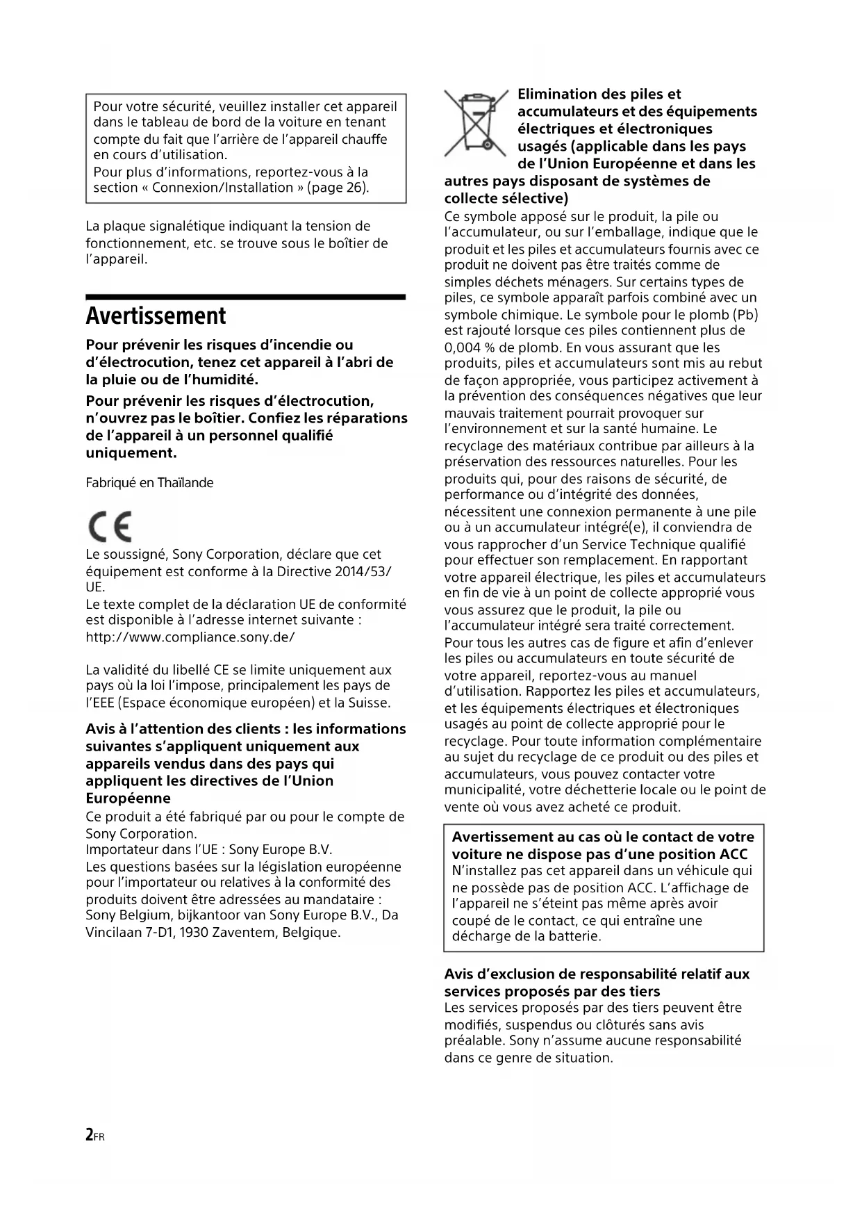 An Armaturenbrett/MittelkonsoleMit dem Fahrzeug gelieferte Teile HalterungHalterung31DE Wenn Sie eine Sicherung austauschen, achten Sie darauf, eine Ersatzsicherung mit dem gleichen Ampere-Wert wie die Originalsicherung zu verwenden. Dieser ist auf der Originalsicherung angegeben. Wenn die Sicherung durchbrennt, überprüfen Sie den Stromanschluss und tauschen die Sicherung aus. Brennt die neue Sicherung ebenfalls durch, kann eine interne Fehlfunktion vorliegen. Wenden Sie sich in einem solchen Fall an Ihren Sony- Händler. Austauschen der Sicherung Sicherung (10 A)2FR La plaque signalétique indiquant la tension de fonctionnement, etc. se trouve sous le boîtier de l’appareil. Avertissement Pour prévenir les risques d’incendie ou d’électrocution, tenez cet appareil à l’abri de la pluie ou de l’humidité. Pour prévenir les risques d’électrocution, n’ouvrez pas le boîtier. Confiez les réparations de l’appareil à un personnel qualifié uniquement. Fabriqué en Thaïlande Le soussigné, Sony Corporation, déclare que cet équipement est conforme à la Directive 2014/53/ UE. Le texte complet de la déclaration UE de conformité est disponible à l’adresse internet suivante : http://www.compliance.sony.de/ La validité du libellé CE se limite uniquement aux pays où la loi l’impose, principalement les pays de l’EEE (Espace économique européen) et la Suisse. Avis à l’attention des clients : les informations suivantes s’appliquent uniquement aux appareils vendus dans des pays qui appliquent les directives de l’Union Européenne Ce produit a été fabriqué par ou pour le compte de Sony Corporation. Importateur dans l’UE : Sony Europe B.V. Les questions basées sur la législation européenne pour l’importateur ou relatives à la conformité des produits doivent être adressées au mandataire : Sony Belgium, bijkantoor van Sony Europe B.V., Da Vincilaan 7-D1, 1930 Zaventem, Belgique. Elimination des piles et accumulateurs et des équipements électriques et électroniques usagés (applicable dans les pays de l’Union Européenne et dans les autres pays disposant de systèmes de collecte sélective) Ce symbole apposé sur le produit, la pile ou l’accumulateur, ou sur l’emballage, indique que le produit et les piles et accumulateurs fournis avec ce produit ne doivent pas être traités comme de simples déchets ménagers. Sur certains types de piles, ce symbole apparaît parfois combiné avec un symbole chimique. Le symbole pour le plomb (Pb) est rajouté lorsque ces piles contiennent plus de 0,004 % de plomb. En vous assurant que les produits, piles et accumulateurs sont mis au rebut de façon appropriée, vous participez activement à la prévention des conséquences négatives que leur mauvais traitement pourrait provoquer sur l’environnement et sur la santé humaine. Le recyclage des matériaux contribue par ailleurs à la préservation des ressources naturelles. Pour les produits qui, pour des raisons de sécurité, de performance ou d’intégrité des données, nécessitent une connexion permanente à une pile ou à un accumulateur intégré(e), il conviendra de vous rapprocher d’un Service Technique qualifié pour effectuer son remplacement. En rapportant votre appareil électrique, les piles et accumulateurs en fin de vie à un point de collecte approprié vous vous assurez que le produit, la pile ou l’accumulateur intégré sera traité correctement. Pour tous les autres cas de figure et afin d’enlever les piles ou accumulateurs en toute sécurité de votre appareil, reportez-vous au manuel d’utilisation. Rapportez les piles et accumulateurs, et les équipements électriques et électroniques usagés au point de collecte approprié pour le recyclage. Pour toute information complémentaire au sujet du recyclage de ce produit ou des piles et accumulateurs, vous pouvez contacter votre municipalité, votre déchetterie locale ou le point de vente où vous avez acheté ce produit. Avis d’exclusion de responsabilité relatif aux services proposés par des tiers Les services proposés par des tiers peuvent être modifiés, suspendus ou clôturés sans avis préalable. Sony n’assume aucune responsabilité dans ce genre de situation. Pour votre sécurité, veuillez installer cet appareil dans le tableau de bord de la voiture en tenant compte du fait que l’arrière de l’appareil chauffe en cours d’utilisation. Pour plus d’informations, reportez-vous à la section « Connexion/Installation » (page 26). Avertissement au cas où le contact de votre voiture ne dispose pas d’une position ACC N’installez pas cet appareil dans un véhicule qui ne possède pas de position ACC. L’affichage de l’appareil ne s’éteint pas même après avoir coupé de le contact, ce qui entraîne une décharge de la batterie.3FR Attention SONY NE PEUT EN AUCUN CAS ETRE TENU