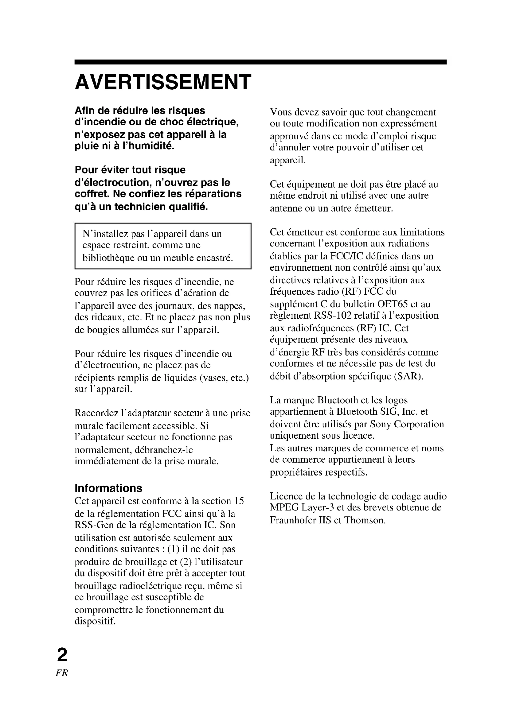 AVERTISSEMENT Afin de réduire les risques d’incendie ou de choc électrique, n’exposez pas cet appareil à la pluie ni à l’humidité. Pour éviter tout risque d’électrocution, n’ouvrez pas le coffret. Ne confiez les réparations qu’à un technicien qualifié. N’installez pas l’appareil dans un espace restreint, comme une bibliothèque ou un meuble encastré. Pour réduire les risques d’incendie, ne couvrez pas les orifices d’aération de l’appareil avec des journaux, des nappes, des rideaux, etc. Et ne placez pas non plus de bougies allumées sur l’appareil. Pour réduire les risques d’incendie ou d’électrocution, ne placez pas de récipients remplis de liquides (vases, etc.) sur l’appareil. Raccordez l’adaptateur secteur à une prise murale facilement accessible. Si l’adaptateur secteur ne fonctionne pas normalement, débranchez-le immédiatement de la prise murale. Informations Cet appareil est conforme à la section 15 de la réglementation FCC ainsi qu’à la RSS-Gen de la réglementation IC. Son utilisation est autorisée seulement aux conditions suivantes : (1) il ne doit pas produire de brouillage et (2) l’utilisateur du dispositif doit être prêt à accepter tout brouillage radioeléctrique reçu, même si ce brouillage est susceptible de compromettre le fonctionnement du dispositif. Vous devez savoir que tout changement ou toute modification non expressément approuvé dans ce mode d’emploi risque d’annuler votre pouvoir d’utiliser cet appareil. Cet équipement ne doit pas être placé au même endroit ni utilisé avec une autre antenne ou un autre émetteur. Cet émetteur est conforme aux limitations concernant l’exposition aux radiations établies par la FCC/IC définies dans un environnement non contrôlé ainsi qu’aux directives relatives à l’exposition aux fréquences radio (RF) FCC du supplément C du bulletin OET65 et au règlement RSS-102 relatif à l’exposition aux radiofréquences (RF) IC. Cet équipement présente des niveaux d’énergie RF très bas considérés comme conformes et ne nécessite pas de test du débit d’absorption spécifique (SAR). La marque Bluetooth et les logos appartiennent à Bluetooth SIG, Inc. et doivent être utilisés par Sony Corporation uniquement sous licence. Les autres marques de commerce et noms de commerce appartiennent à leurs propriétaires respectifs. Licence de la technologie de codage audio MPEG Layer-3 et des brevets obtenue de Fraunhofer IIS et Thomson.3