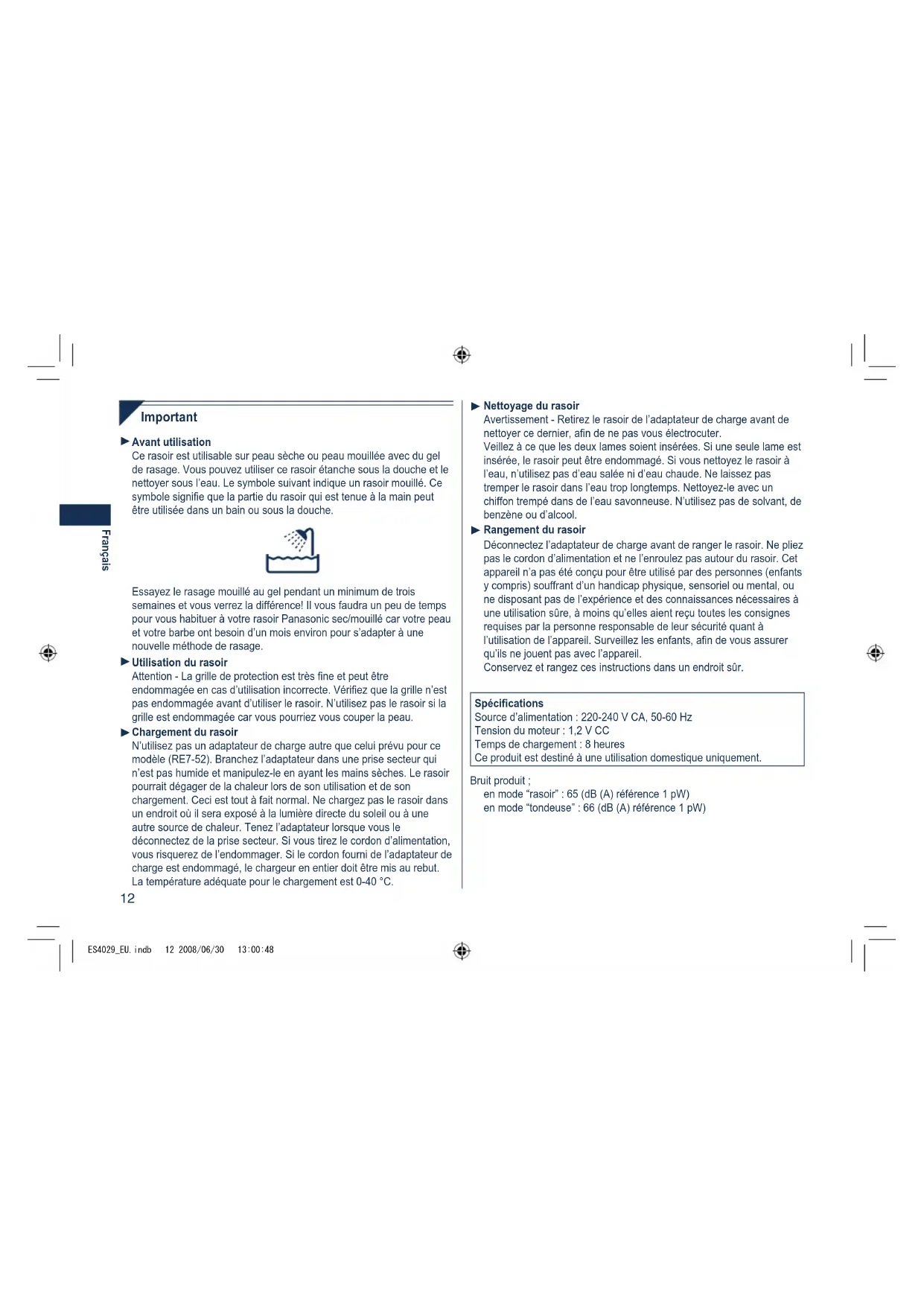 Nettoyagedurasoir Avertissement - Retirez le rasoir de l’adaptateur de charge avant de nettoyer ce dernier, an de ne pas vous électrocuter. Veillez à ce que les deux lames soient insérées. Si une seule lame est insérée, le rasoir peut être endommagé. Si vous nettoyez le rasoir à l’eau, n’utilisez pas d’eau salée ni d’eau chaude. Ne laissez pas tremper le rasoir dans l’eau trop longtemps. Nettoyez-le avec un chiffon trempé dans de l’eau savonneuse. N’utilisez pas de solvant, de benzène ou d’alcool. Rangementdurasoir Déconnectez l’adaptateur de charge avant de ranger le rasoir. Ne pliez pas le cordon d’alimentation et ne l’enroulez pas autour du rasoir. Cet appareil n’a pas été conçu pour être utilisé par des personnes (enfants y compris) souffrant d’un handicap physique, sensoriel ou mental, ou ne disposant pas de l’expérience et des connaissances nécessaires à une utilisation sûre, à moins qu’elles aient reçu toutes les consignes requises par la personne responsable de leur sécurité quant à l’utilisation de l’appareil. Surveillez les enfants, an de vous assurer qu’ils ne jouent pas avec l’appareil. Conservez et rangez ces instructions dans un endroit sûr. Spécications Source d’alimentation : 220-240 V CA, 50-60 Hz Tension du moteur : 1,2 V CC Temps de chargement : 8 heures Ce produit est destiné à une utilisation domestique uniquement. Bruit produit ; en mode “rasoir” : 65 (dB (A) référence 1 pW) en mode “tondeuse” : 66 (dB (A) référence 1 pW)