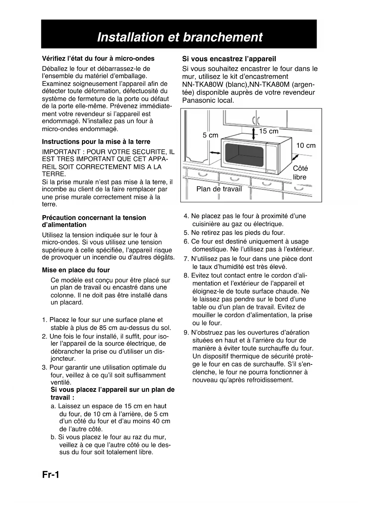 situées en haut et à lʼarrière du four de manière à éviter toute surchauffe du four. Un dispositif thermique de sécurité protè- ge le four en cas de surchauffe. Sʼil sʼen- clenche, le four ne pourra fonctionner à nouveau quʼaprès refroidissement. Plan de travail Côté libre 10 cm 15 cm 5 cm Fr-1 Si vous encastrez lʼappareil Si vous souhaitez encastrer le four dans le mur, utilisez le kit dʼencastrement NN-TKA80W (blanc),NN-TKA80M (argen- tée) disponible auprès de votre revendeur Panasonic local.Fr-2 Français Installation et branchement AVERTISSEMENT