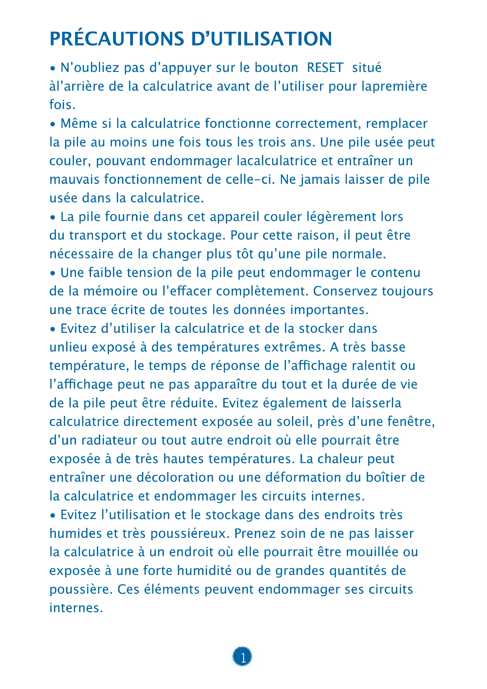 - N’essayez jamais de tordre ou de plier la calculatri- ce. Evitez de porter la calculatrice dans une poche de pantalons ou tout autre vêtement ajusté où elle pourrait être tordue ou pliée.