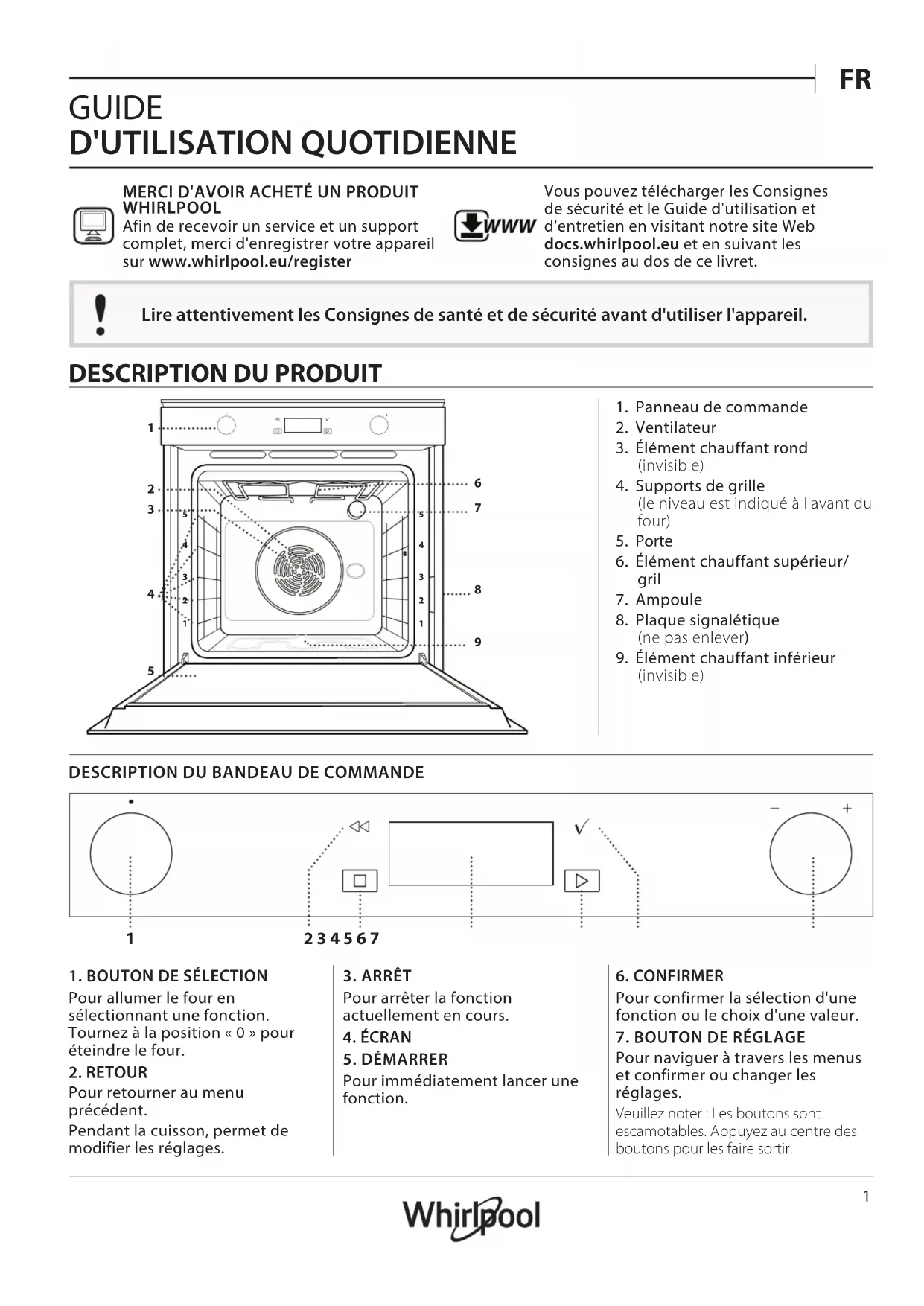GUIDE D'UTILISATION QUOTIDIENNE MERCI D'AVOIR ACHETÉ UN PRODUIT WHIRLPOOLAfin de recevoir un service et un support complet, merci d'enregistrer votre appareil sur www . whirlpool . eu/ register WWW Vous pouvez télécharger les Consignes de sécurité et le Guide d'utilisation et d'entretien en visitant notre site Web docs.whirlpool. eu et en suivant les consignes au dos de ce livret. Lire attentivement les Consignes de santé et de sécurité avant d'utiliser l'appareil.