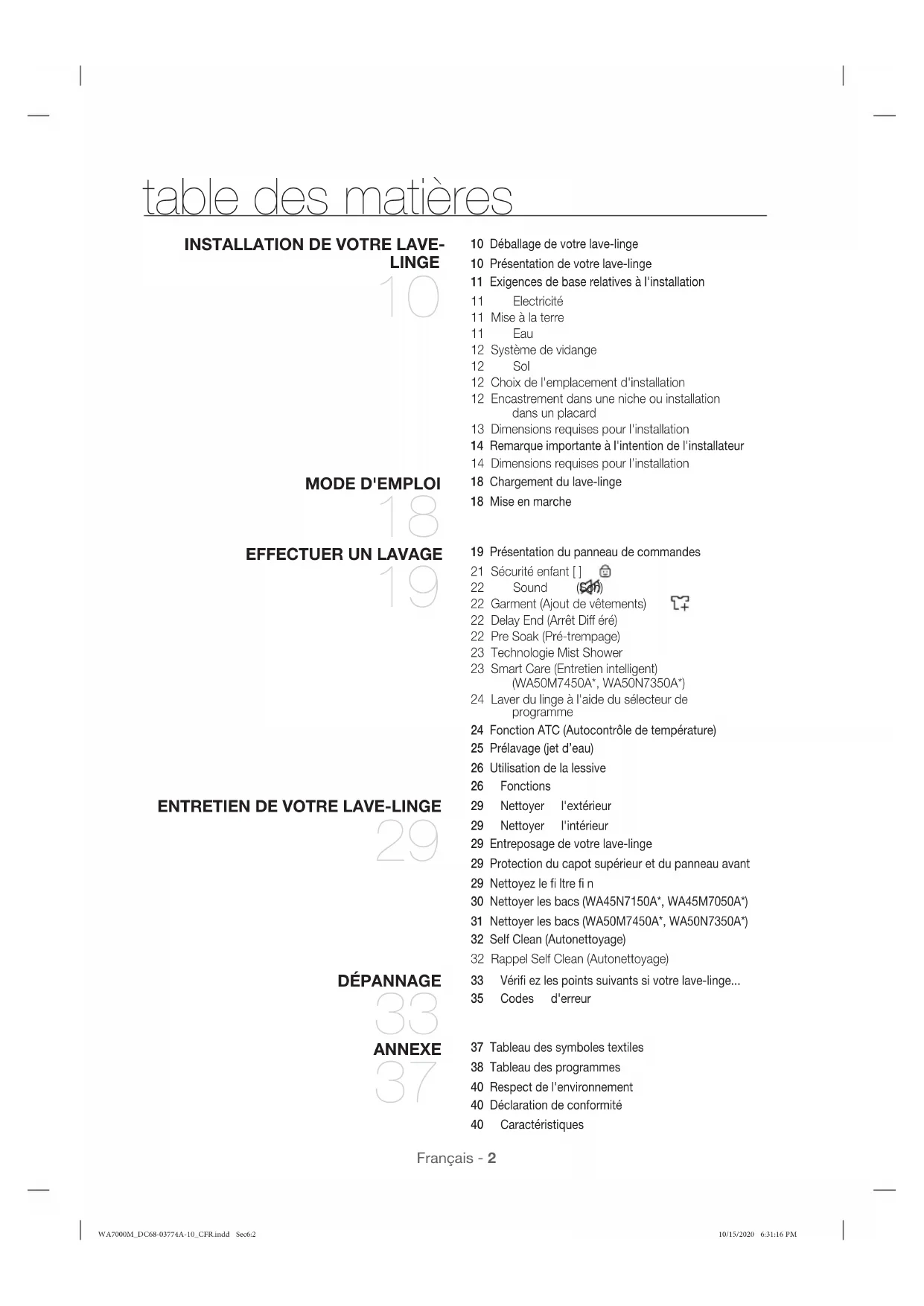 WA7000M_DC68-03774A-10_CFR.indd Sec1:8WA7000M_DC68-03774A-10_CFR.indd Sec1:8 10/15/2020 6:31:16 PM10/15/2020 6:31:16 PMFrançais - 9 Ne placez pas d'objets (ex. : chaussures, déchets alimentaires ou animaux) autres que du linge dans le lave-linge. - Risque de vibrations anormales et d'endommagement ; danger de mort pour les animaux. N'actionnez pas les boutons à l'aide d'objets tranchants tels que des aiguilles, des couteaux, les ongles etc. - Cela pourrait entraîner un choc électrique ou des blessures. Ne lavez pas de linge entré en contact avec des huiles, crèmes ou lotions utilisées dans les salons de beauté ou de massage. - Ceci pourrait provoquer une déformation du joint en caoutchouc, entraînant des fuites d'eau. Ne laissez pas d'objets métalliques (ex. : épingles de sûreté, à cheveux, etc.) dans le tambour ; ne laissez pas d'agent de blanchiment dans le tambour pendant des périodes prolongées. - Ceci pourrait entraîner l'apparition de rouille sur le tambour. - Si de la rouille apparaît sur la surface du tambour, appliquez un produit de nettoyage neutre et frottez à l'aide d'une éponge. N'utilisez jamais de brosse métallique. N'utilisez pas directement de solvants de nettoyage à sec et ne lavez, ne rincez et n'essorez pas de linge entré en contact avec des solvants de nettoyage à sec. - Risque de combustion ou d'infl ammation spontanée résultant de la chaleur dégagée par l'oxydation de l'huile. N'utilisez pas d'eau chaude provenant d'appareils de refroidissement/de réchau ement d'eau. - Ceci pourrait entraîner des dysfonctionnements du lave-linge. N'utilisez pas de savon naturel pour les mains dans le lave-linge. - Risque de dysfonctionnement, de décoloration, d'oxydation ou de dégagement de mauvaises odeurs. Ne lavez pas d'articles de grande taille tels que du linge de lit dans un fi let de lavage. - Dans le cas contraire, des vibrations anormales peuvent engendrer des blessures. - Placez les plus petits objets, tels que des chaussettes délicates et de la lingerie, dans le fi let de lavage. N'utilisez pas de détergent solidifi é. - S'il s'accumule dans le lave-linge, des fuites d'eau peuvent en résulter. Ne lavez pas les lingettes jetables ou les paillassons. - Le sable risquerait de s'accumuler à l'intérieur du lave-linge. Les performances de certaines fonctions s'en trouveraient altérées (ex. : essorage).